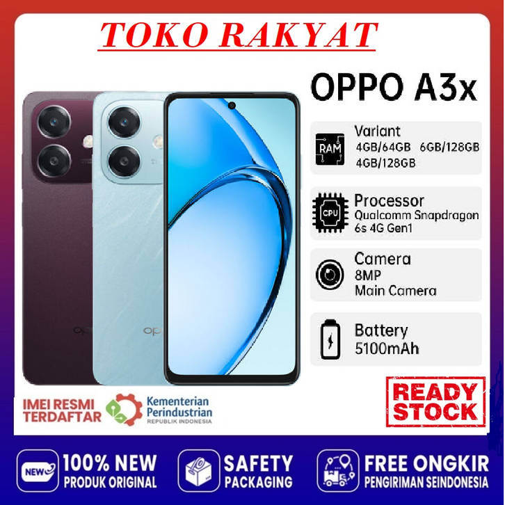(BEBAS ONGKIR) Hp OPPO A3X RAM 6+128GB | Snapdragon 6s 4G Gen 1 | Dual Camera 8MP | Batery 5100mAh
