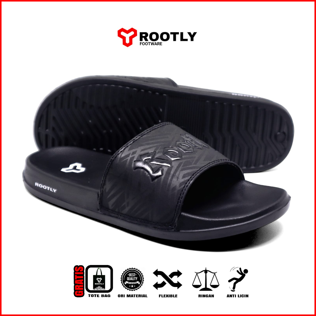 Rootly - Sandal Slipper Pria Slide On Full Black Anti Slip