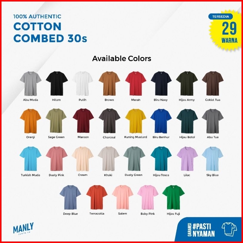 1.HITAM, 2.BIRU DONGKER, 3.MAROON BURGUNDY, 4.HIJAU BOTOL, 5. ABU TUA, 7. TURKIS MUDA, 9.CHRACOAL, 10.PUTIH, 11. COKLAT, 12. HIJAU ARMY, 6.MERAH SPESIAL, 8. BIRU BENHUR, 13. BROWN, 14. SAGE GREEN, 15. TERACOTA, 16. ABU MUDA, 17. LILAC, 18. SKY BLUE, 19. HIJAU TOSCA, 20. DUSTY PINK, 21. DUSTY GREEN, 22. KUNING MUSTARD, 23. SALEM, 24. CREAM, 25. KHAKY, 26. ORENJI, 27. DEEP BLUE, 28. PINK BABY, 29. HIJAU FUJI, 30. ATLANTIC SEA, 31. KUNING KENARI
