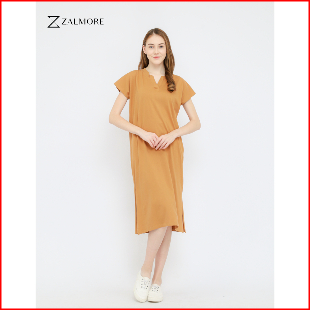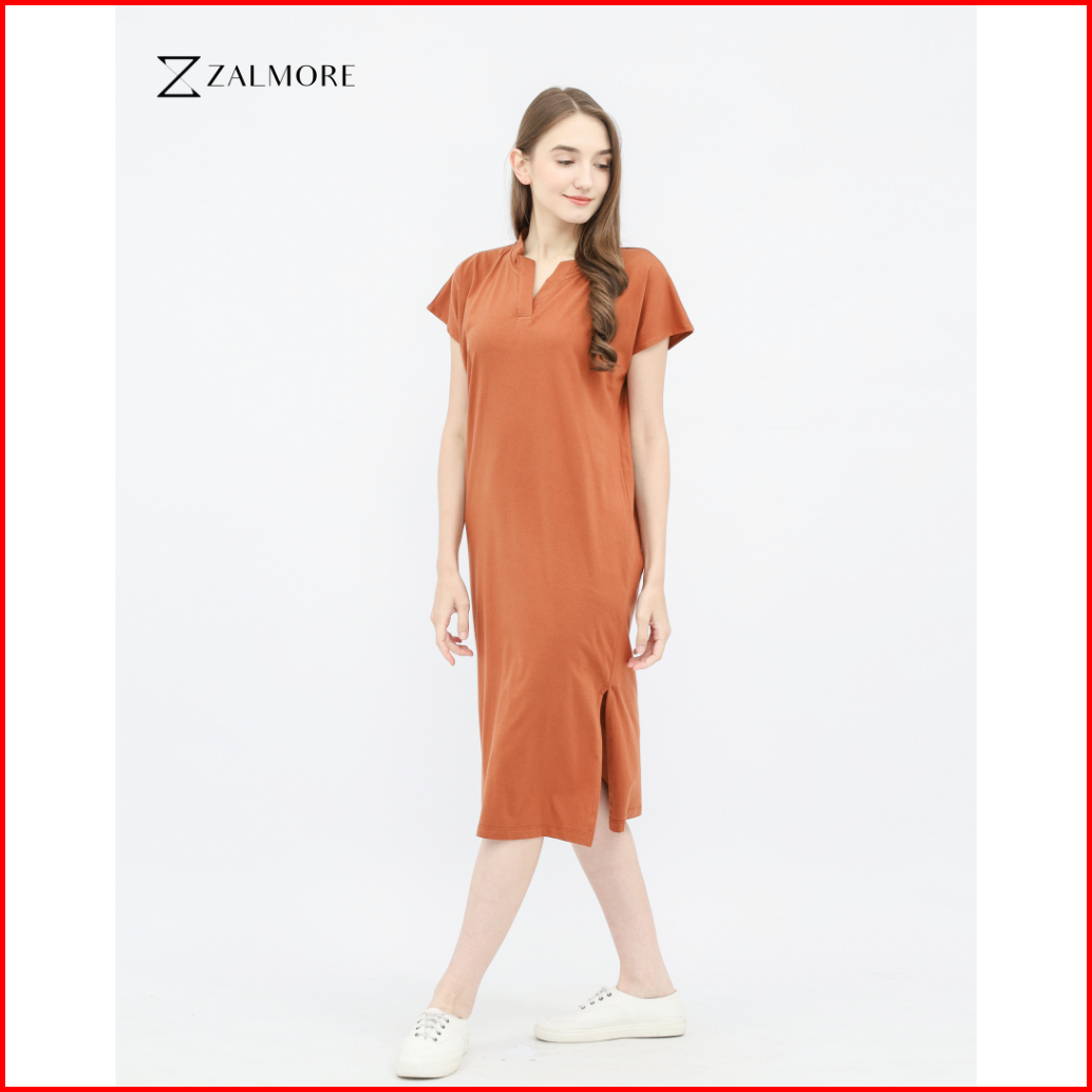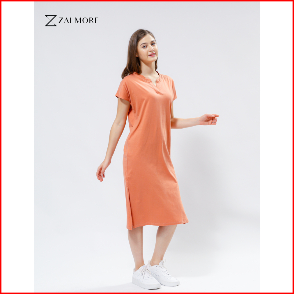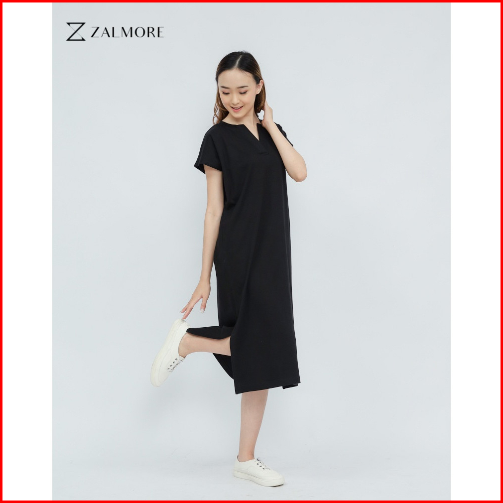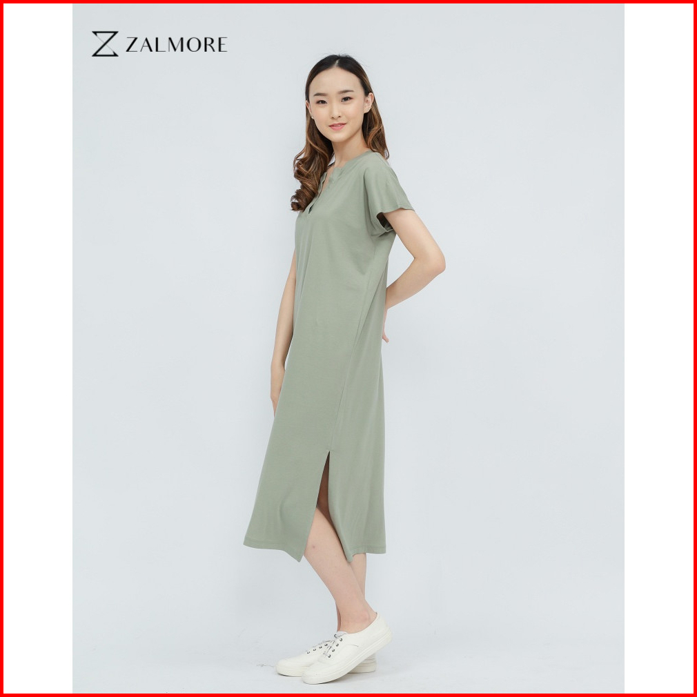 Zalmore Luma Cotton Vneck Loose Midi Dress With Slit Premium Cotton