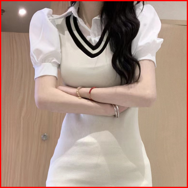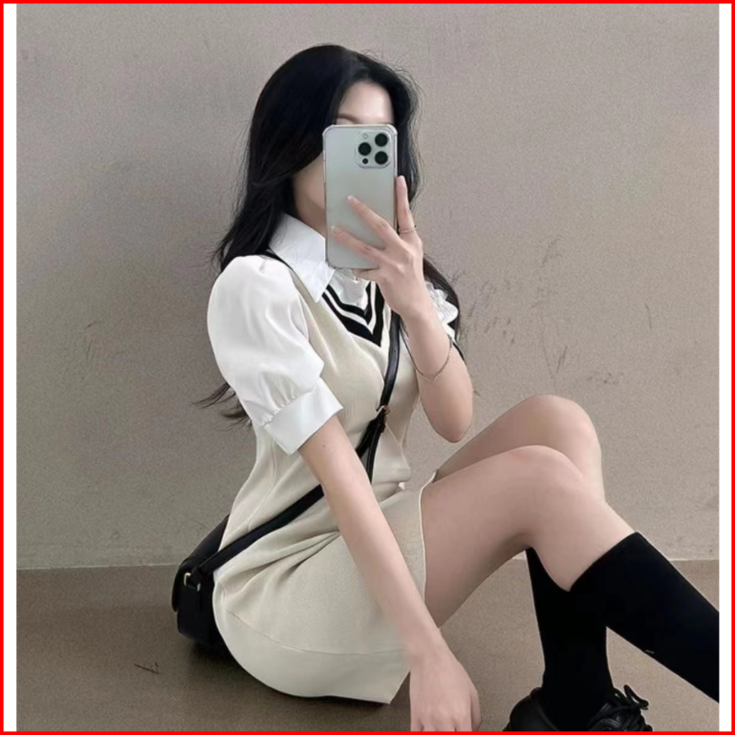 Premium Korean Preppy Fake Two Piece Collar Short Puff Sleeve Knit Vest Mini Dress 2067