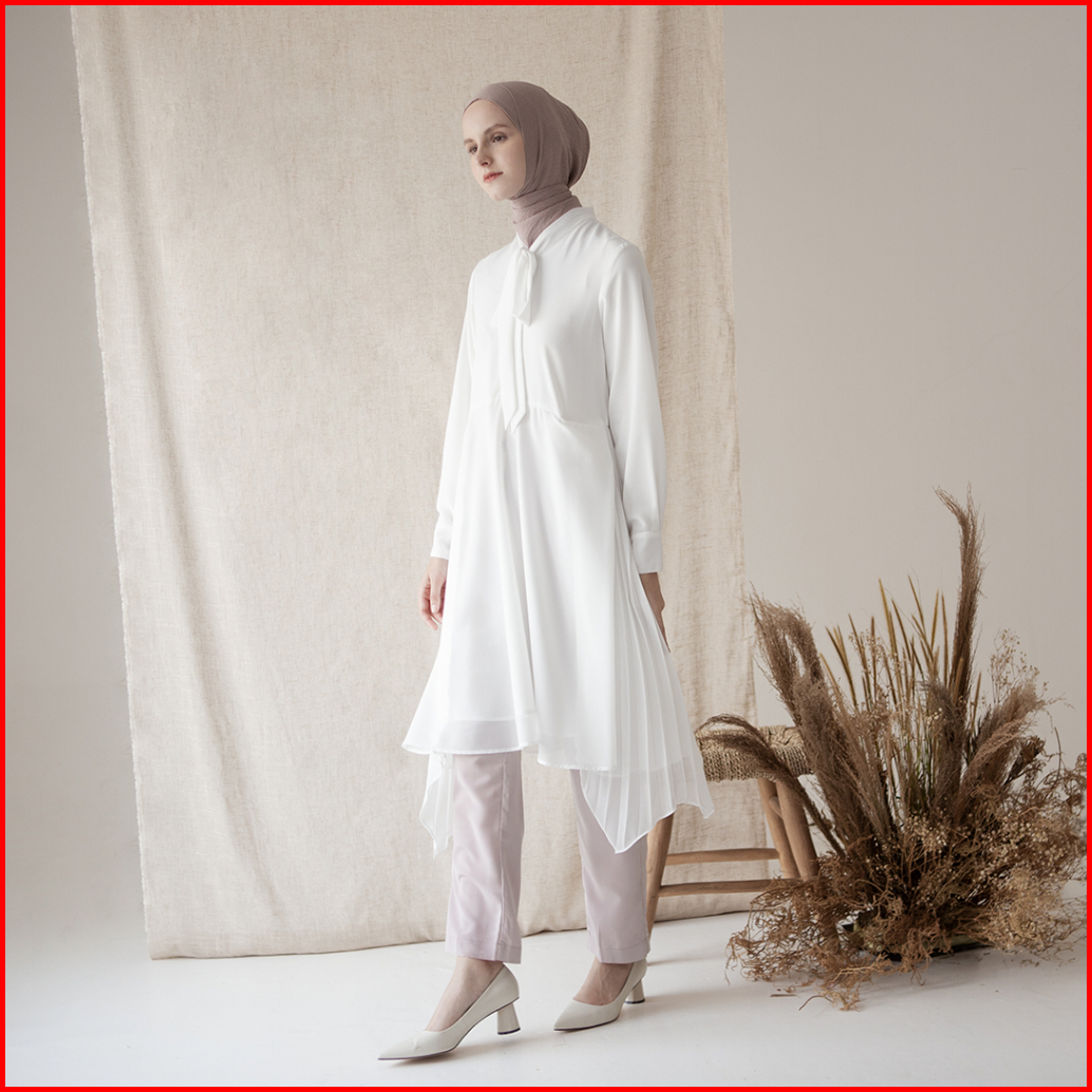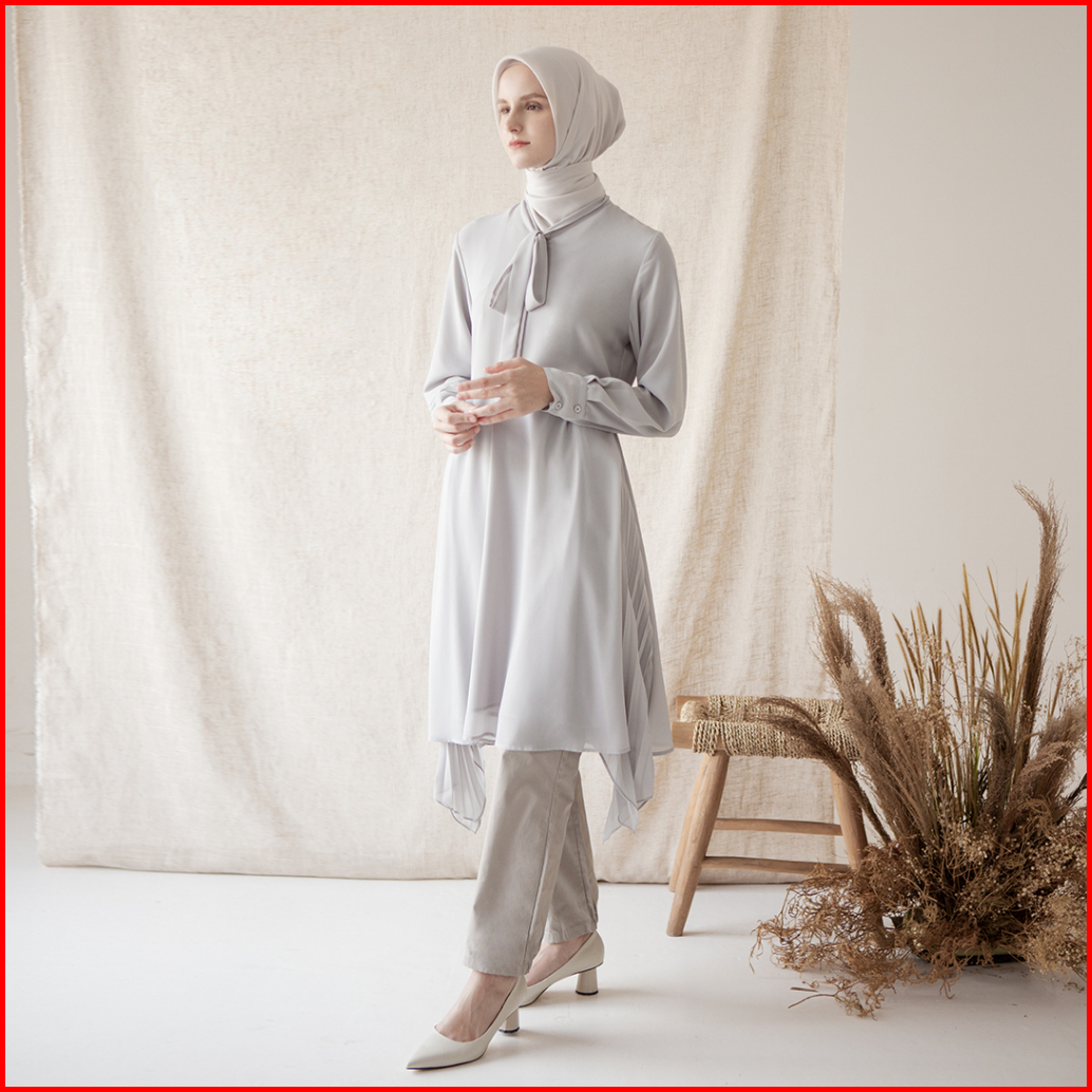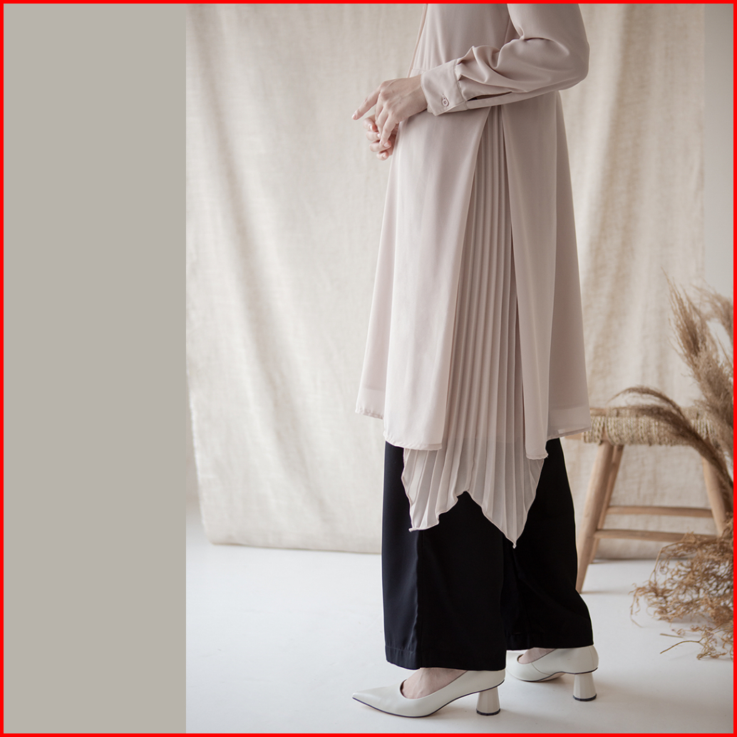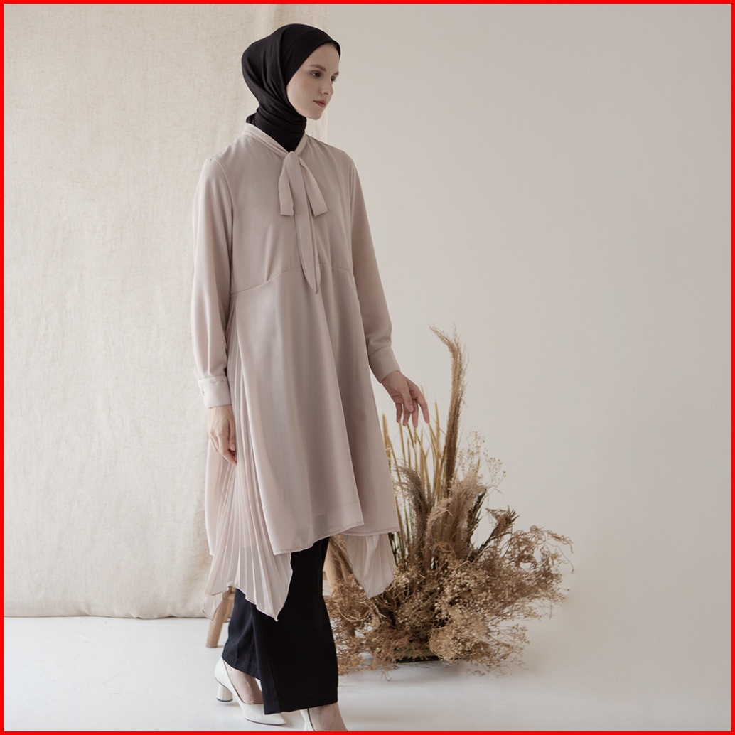Aria By Aska Label - Tunik Wanita Plisket Atasan Blouse Wanita Aksen Pita Ikat Di Bagian Leher Dan Plisket Di Bagian Sam