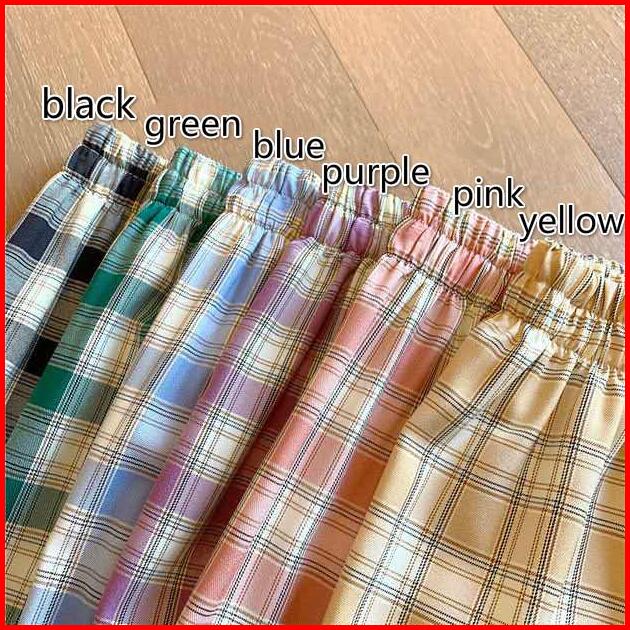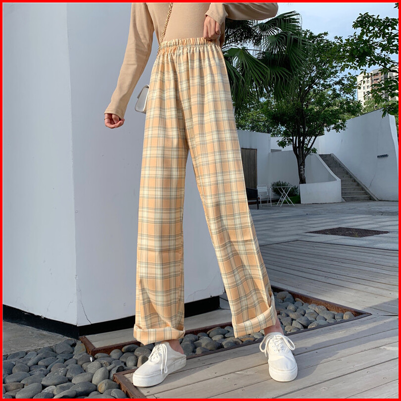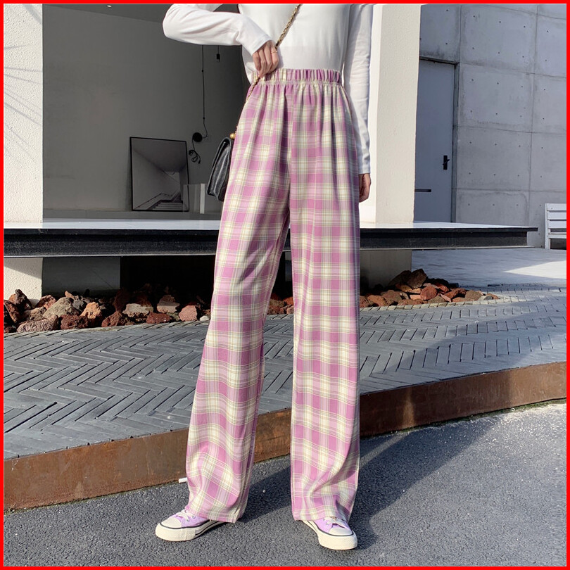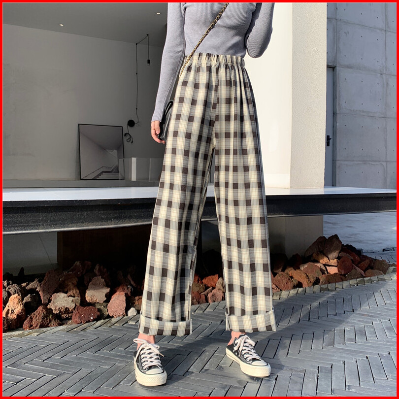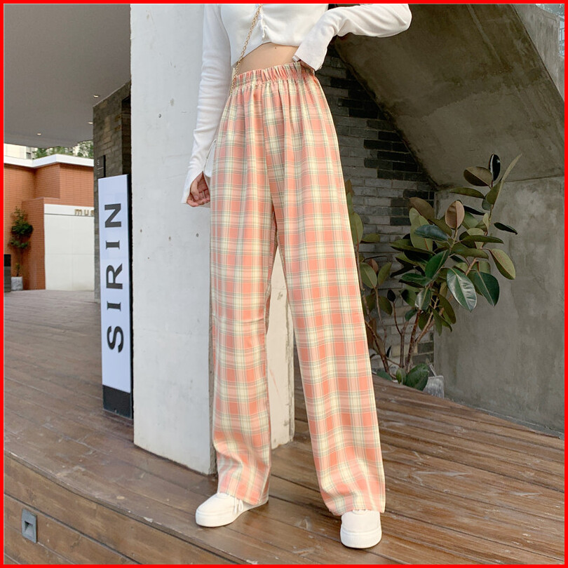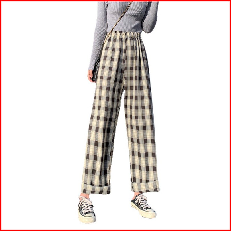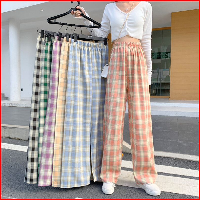 Celana Panjang Model Longgar High Waist Lebar Lurus Motif Kotak-kotak 5 Warna Untuk Wanita