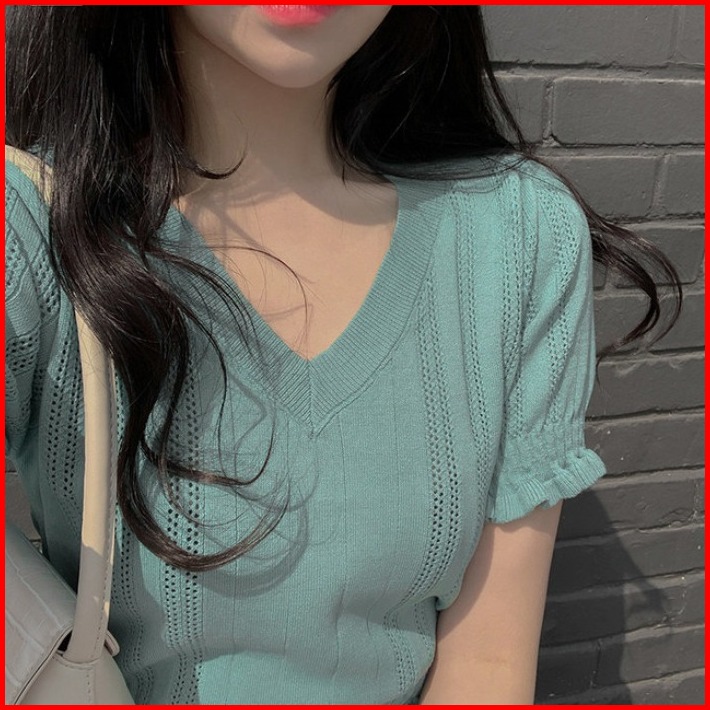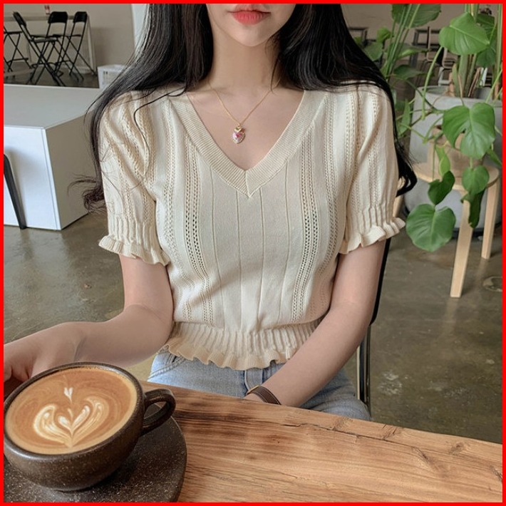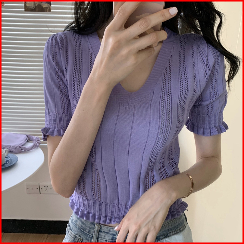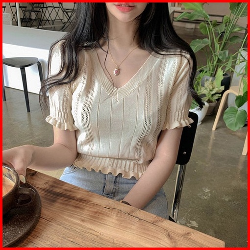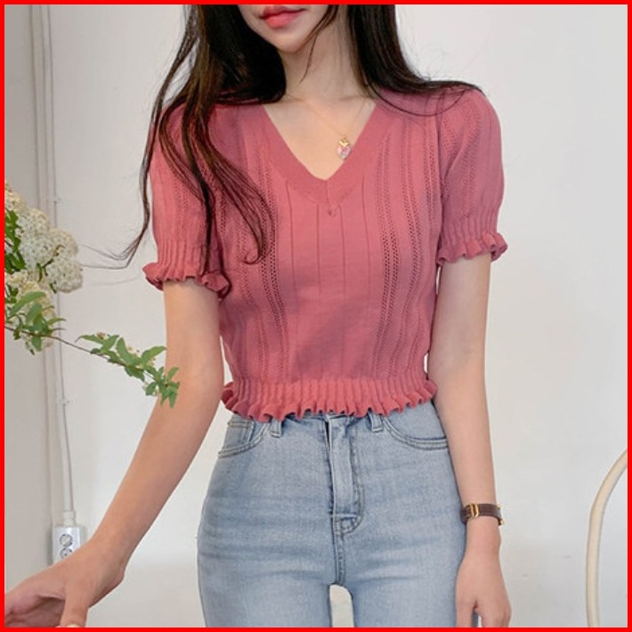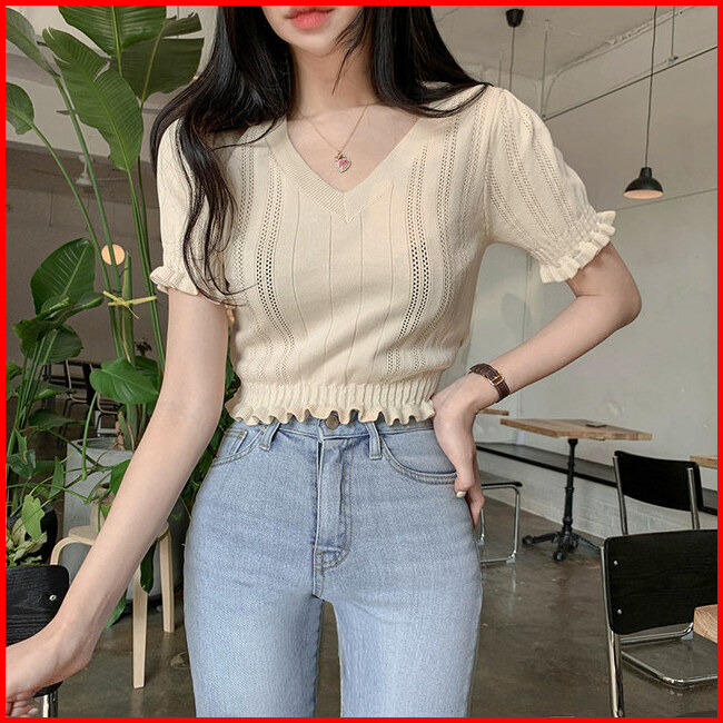 Kaos T-shirt Wanita Model Crop-top Lengan Pendek Dengan Bahan Rajut Dan Kerah Deep-v Neck Bergaya Korea