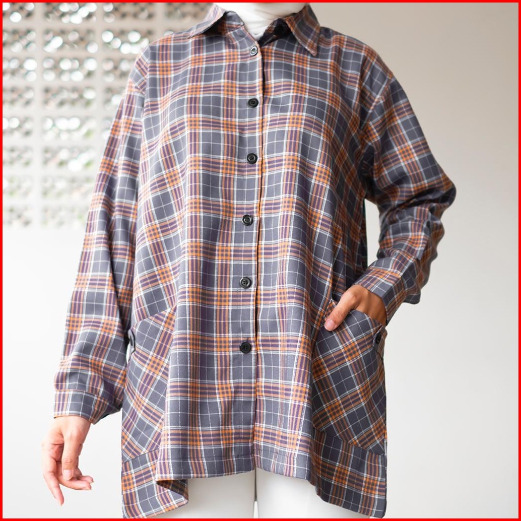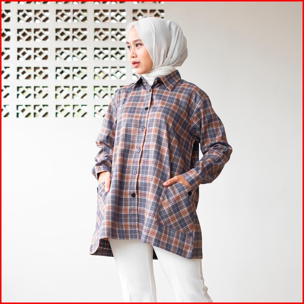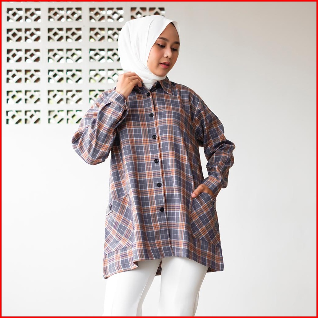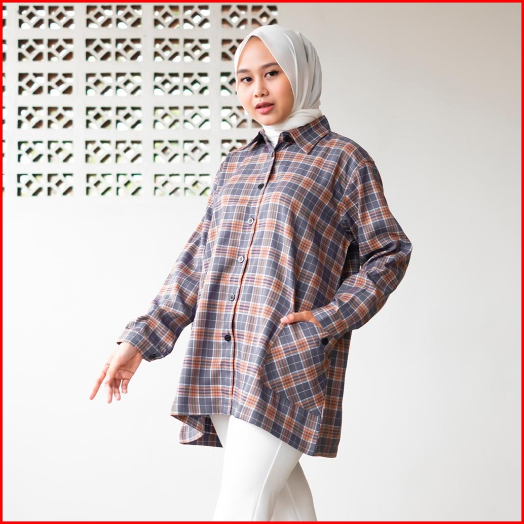 Haymeeidn - Kemeja Tunik Flanel Atasan Wanita Kotak-kotak