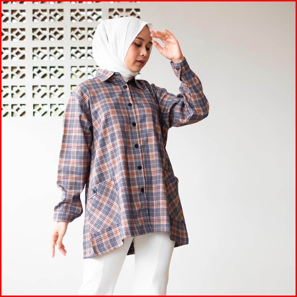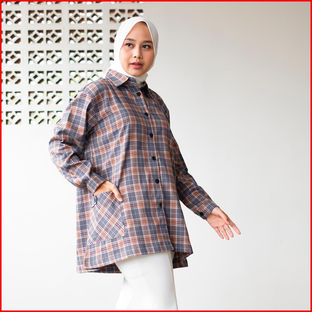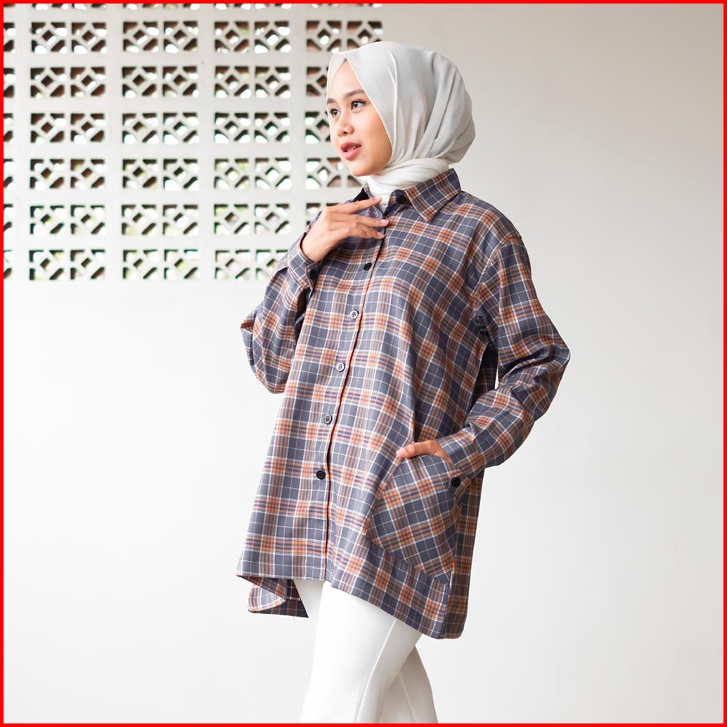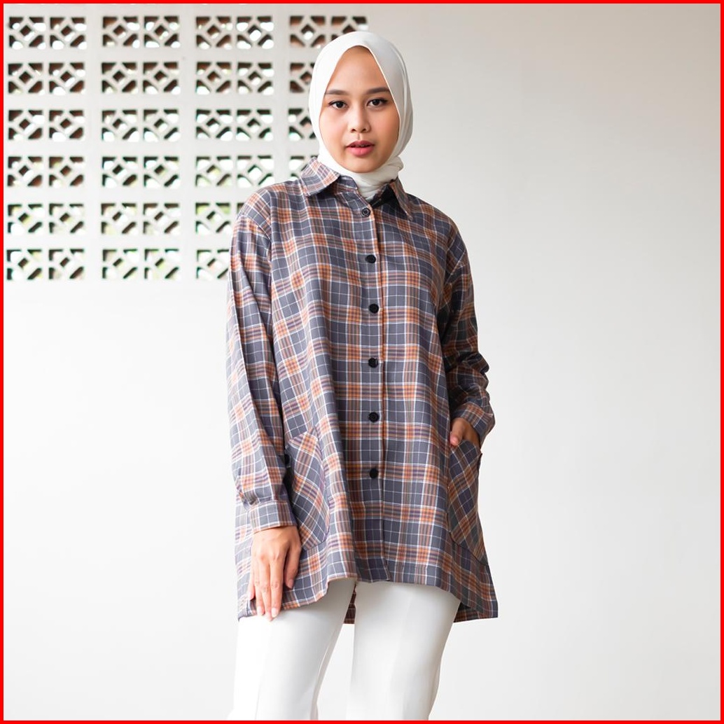 Haymeeidn - Kemeja Tunik Flanel Atasan Wanita Kotak-kotak
