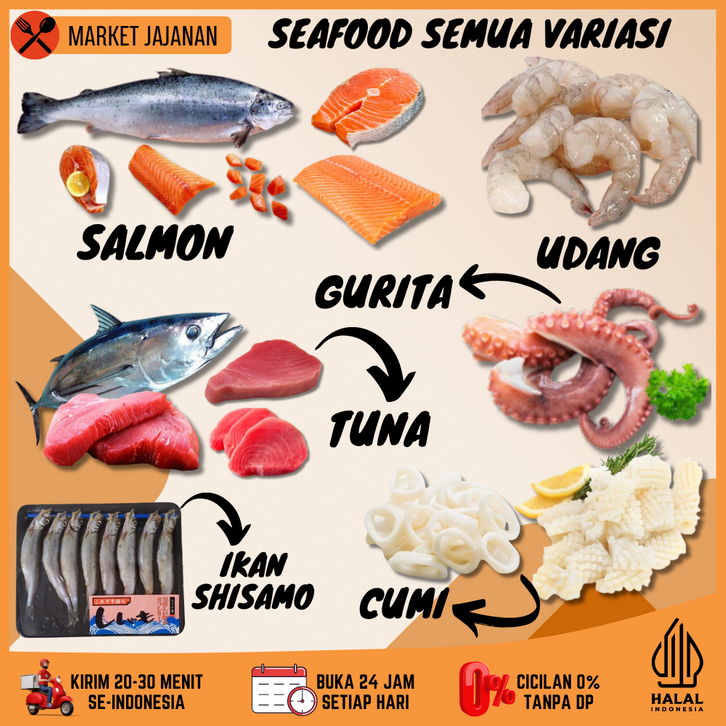 TALIPA FISH FILET 1 KG, TALIPA FISH FILET 500 GR, IKAN SHISAMO/IKAN CIPUNG, KEPALAA SALMON, IKAN MACKAREL UTUH 1KG, IKAN BANDENG 300-400 GR, IKAN CUCUT FILET 1KG, IKAN DORI FILLET PREMIUM 1 KG, SALMON FILET 500 GR, IKAN DORI LOKAL GRADE B 1 KG, SALMON FILET 1 KG, SALMON FILET SASHIMI 500 GR (SASHIMI GRADE), SALMON FILET SASHIMI 1 KG (SASHIMI GRADE), SALMON FILET 1 LION 1.5 KG, TULANG SALMON 1 KG, SIRIP SALMON 500 GR, TUNA FILET 500 GR, TUNA FILET 1 KG, CUMI FLOWER 500 GR, CUMI KUPAS 500 GR, CUMI TUBE KEMASAN 1 KG, CUMI RING 500 GR, CUMI RING 1 KG, UDANG KUPAS UKURAN BESAR 500 GR, UDANG KUPAS KECIL 1 KG, GURITA POTONG 1 KG, CAPIT KEPITING 500 GR, + EXTRA PACKING, 1
