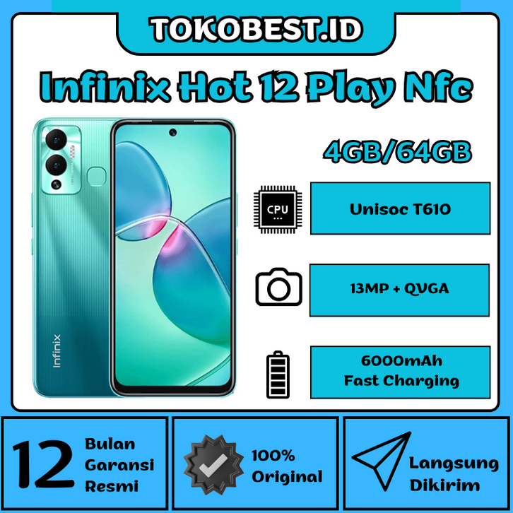 Infinix Hot 12 Play NFC 4GB/64GB | UNISOC Tiger T610 | 6000mAh Fast Charging | Original Garansi Resmi 12 Bulan.