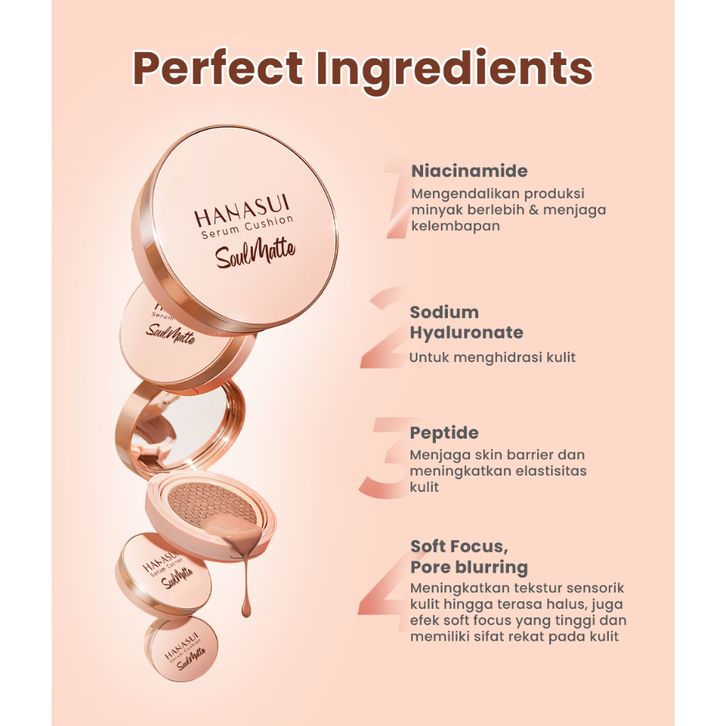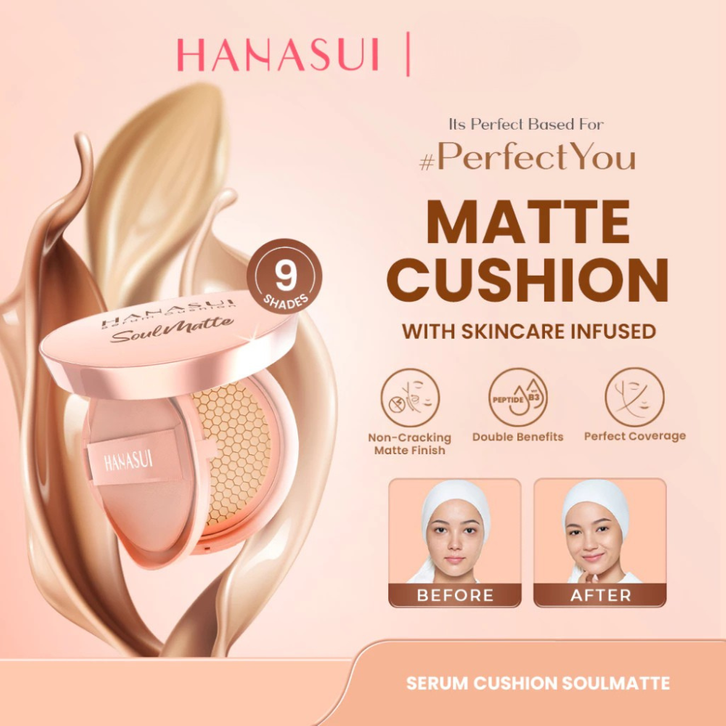 CUSHION HANASUI MATTE FLAWLESS FINISH UVA UVB PROTECTION PERFECT COVERAGE MENYAMARKAN PORI GARIS HALUS NODA HITAM WAJAH