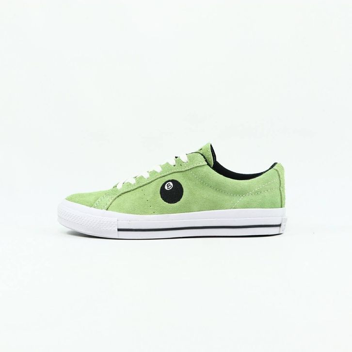 SEPATU STUSSY X CONVERSE ONE STAR PRO OX LOW 8 BALL GREEN FLASH WHITE BLACK ORIGINAL BNIB FULL TAG BARCODE BAHAN LEATHER