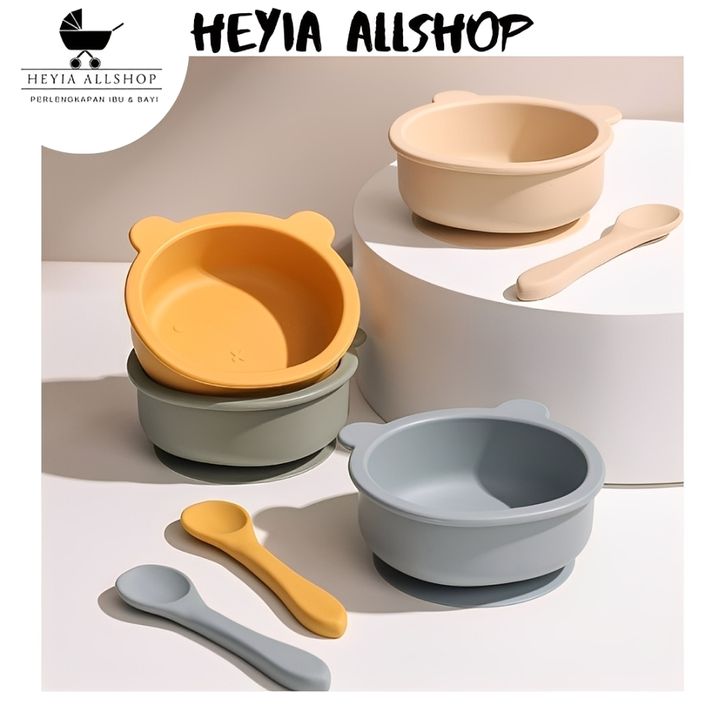 Mangkok Mpasi Sendok Bayi Silikon Tahan Panas Anti Tumpah BPA FREE Bear Food Grade Best Seller Termurah Heyia Allshop