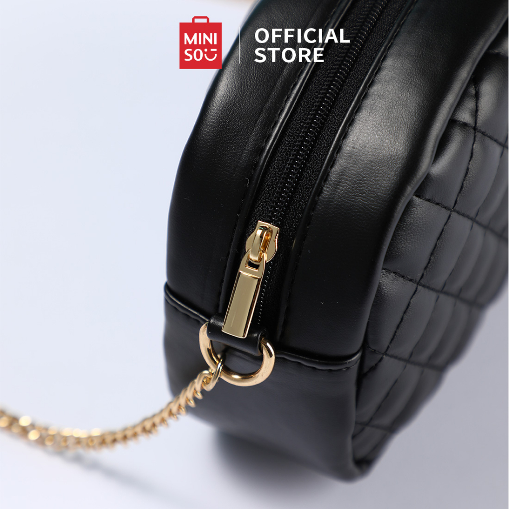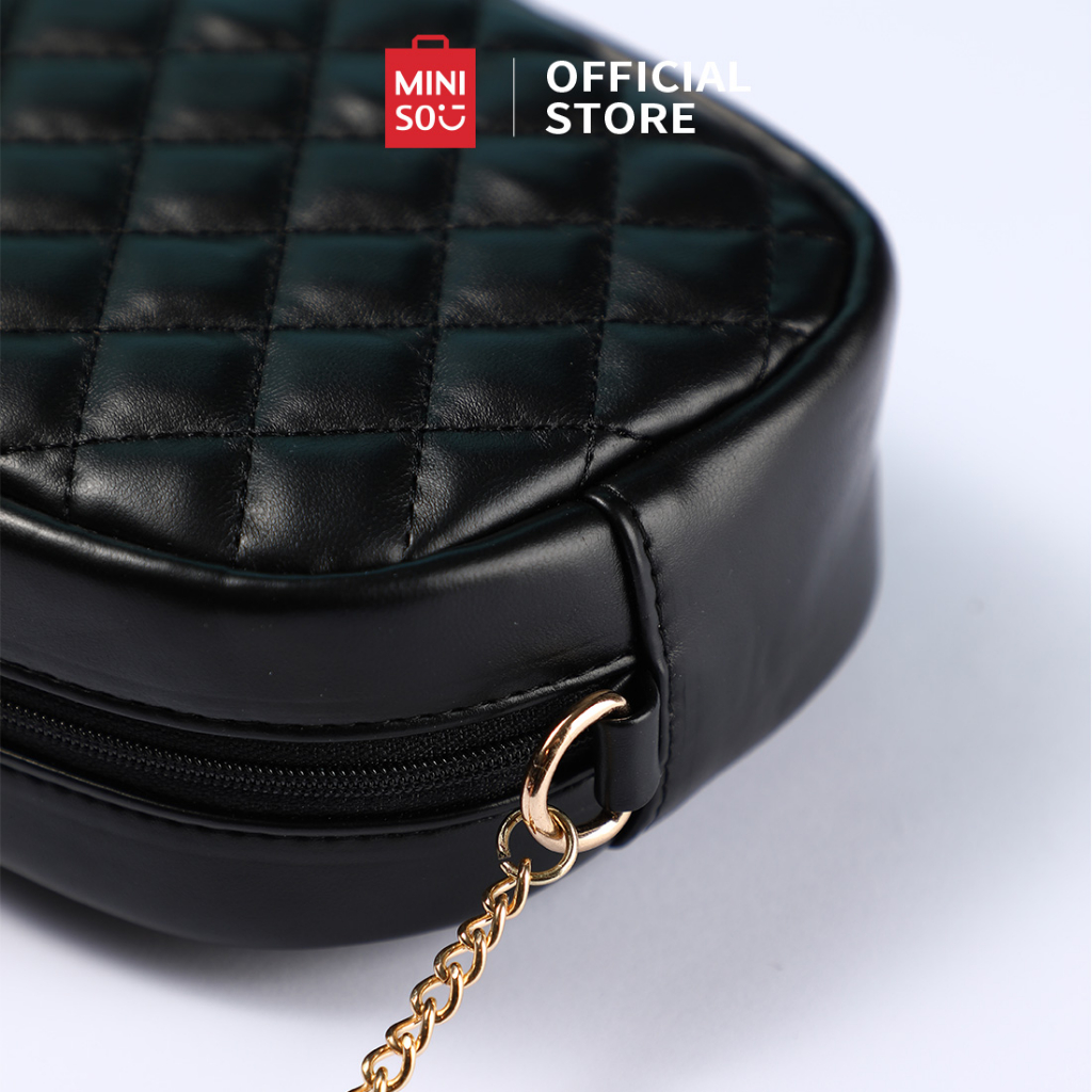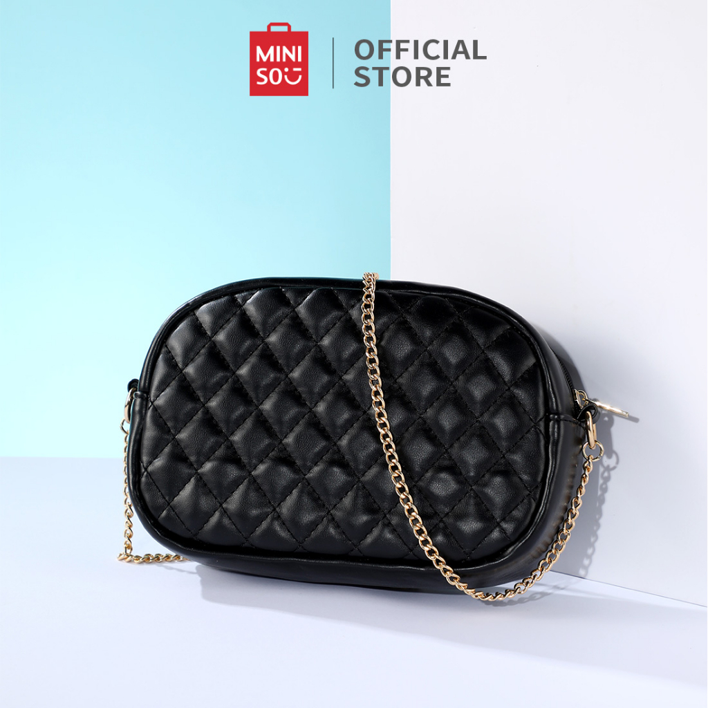 MINISO TAS SELEMPANG TAS WANITA HITAM DENGAN RANTAI POLA KISI BERLIAN BERLAPIS PU KAIN LEMBUT KAPASITAS TINGGI