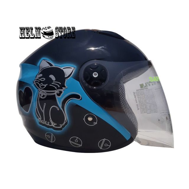 HELM BMC MILAN MOTIF DORAEMON & CAT SILUET BLACK BLUE HALF FACE SNI HELM KARACTER ORIGINAL