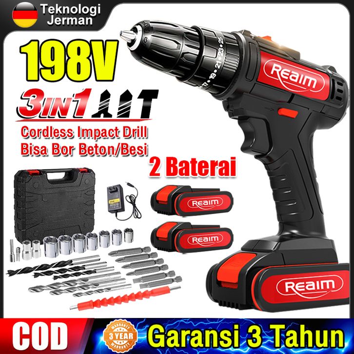 Mesin Bor Baterai Reaim 198 Volt Impact Drill Original Bor Listrik 198 VF Bor Cas Bor Portable Bor Tangan Listrik 198VF
