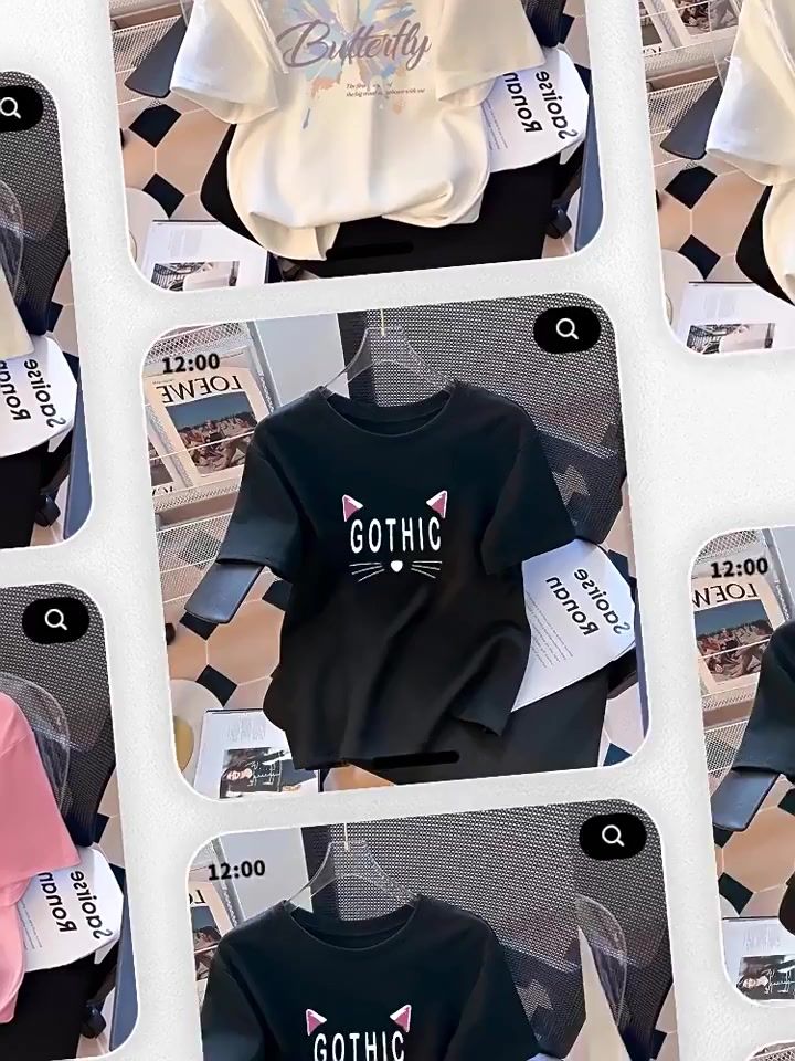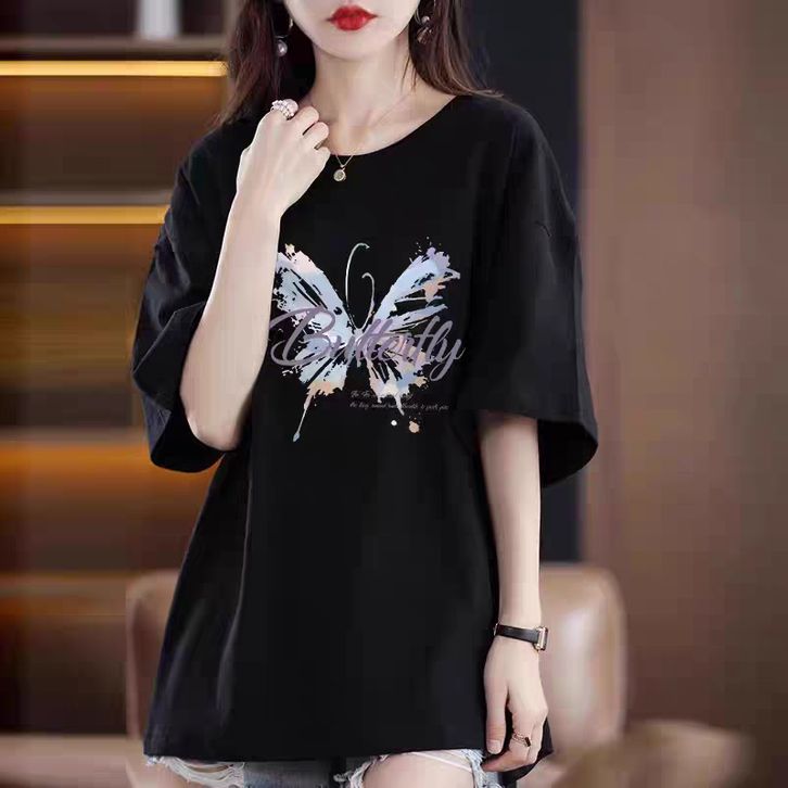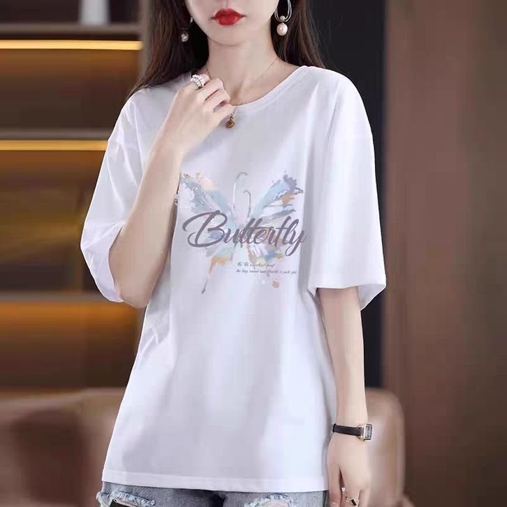 Kaos Wanita Katun Lengan Pendek Longgar & Slimming - Sablon Kupu-Kupu Estetik, Gaya Trendy untuk Musim Panas 2025