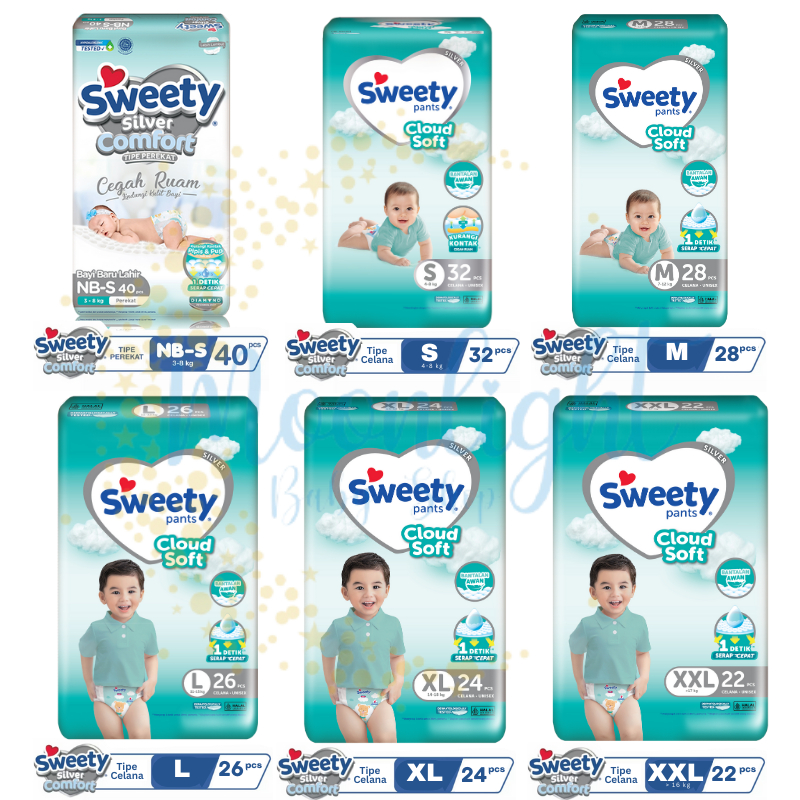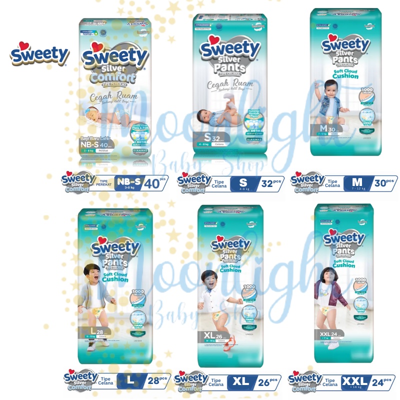 SWEETY SILVER PANTS TAPE POPOK BAYI PEREKAT NBS40/S32/M28/L26/XL24/XXL22