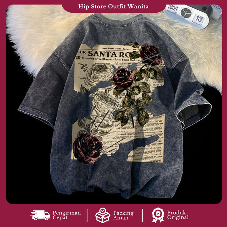 KAOS WANITA GAYA VINTAGE MOTIF PRINT BAHAN COTTON COMBED PREMIUM T SHIRT WASHING BLACK SANTA ROSE BASIC V1