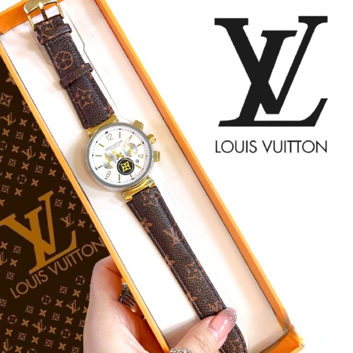 Jam Tangan Wanita LV Kulit L91V Chrono Tanggal Aktif Free Box, Paperbag & Baterai