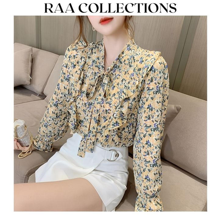 Atasan Kemeja Wanita Lengan Panjang Casual Blouse Motif Bunga Bahan Sifon Korea Style Seller Termurah Raa Collections