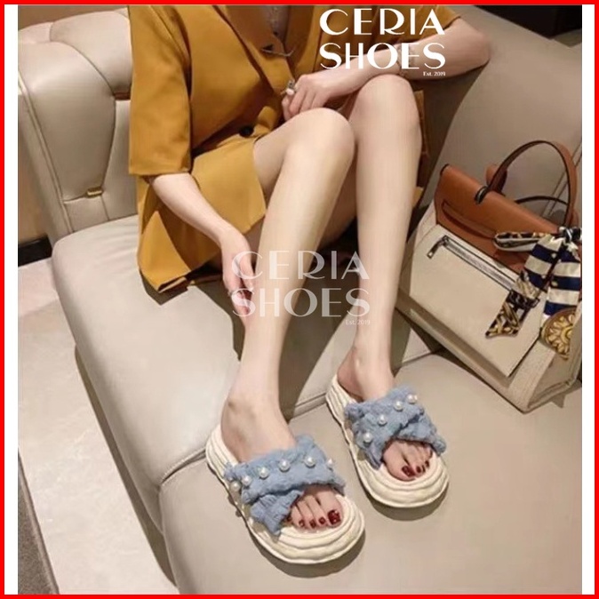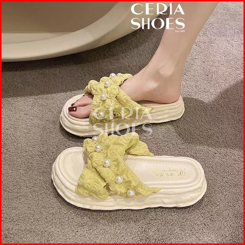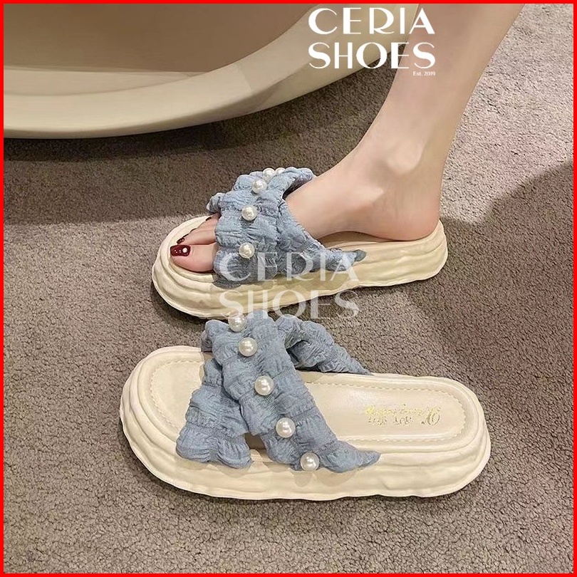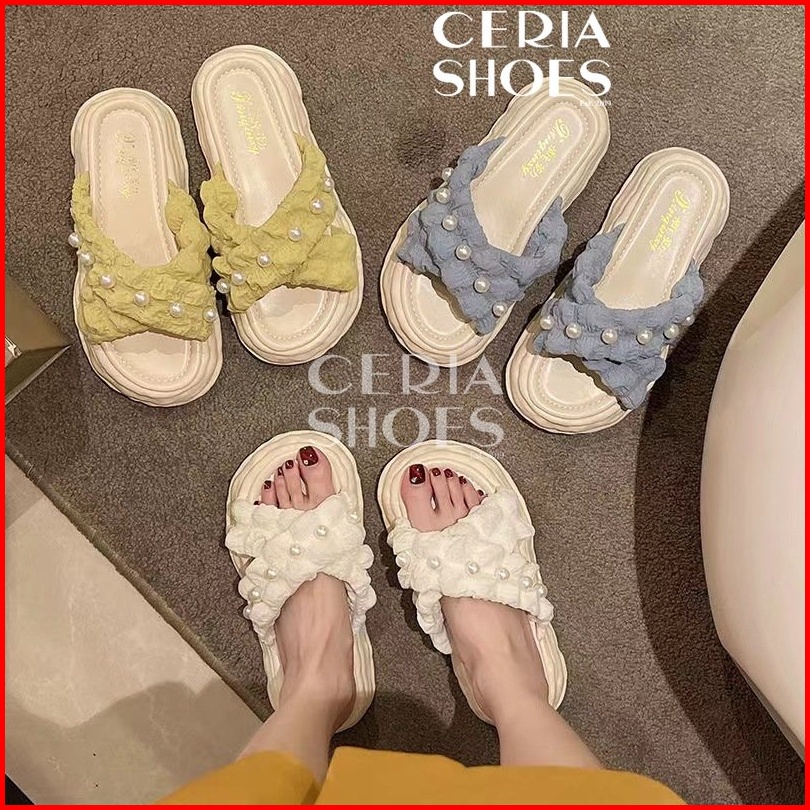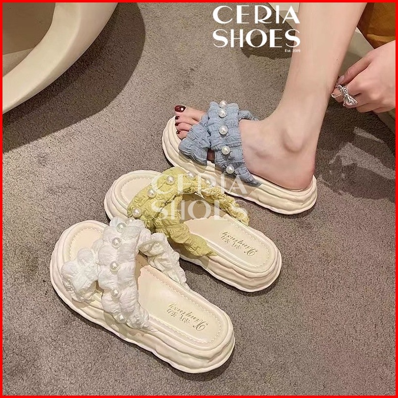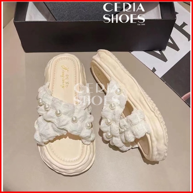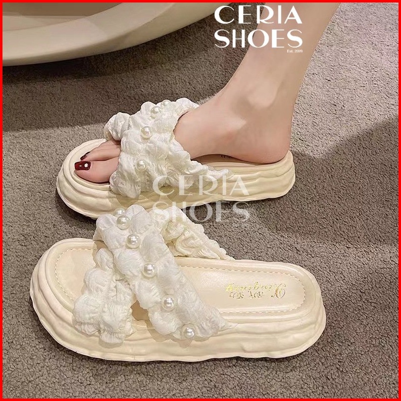 Pvc Sandal Slop Wanita Jelly Import Motif Kain Mutiara Bahan Lentur Empuk Tebal Non-slip Sole Super Soft Cross Cake