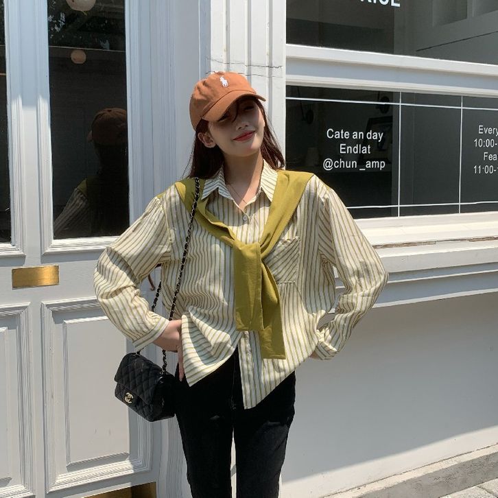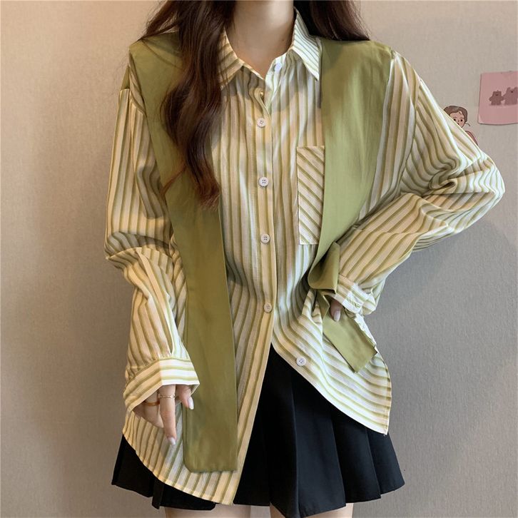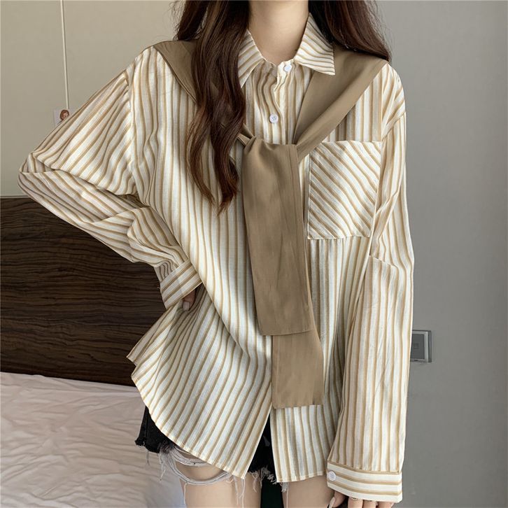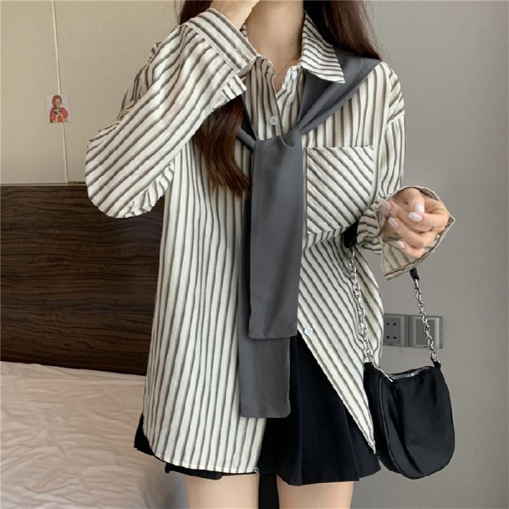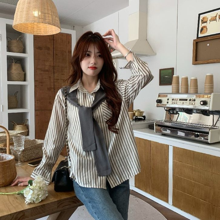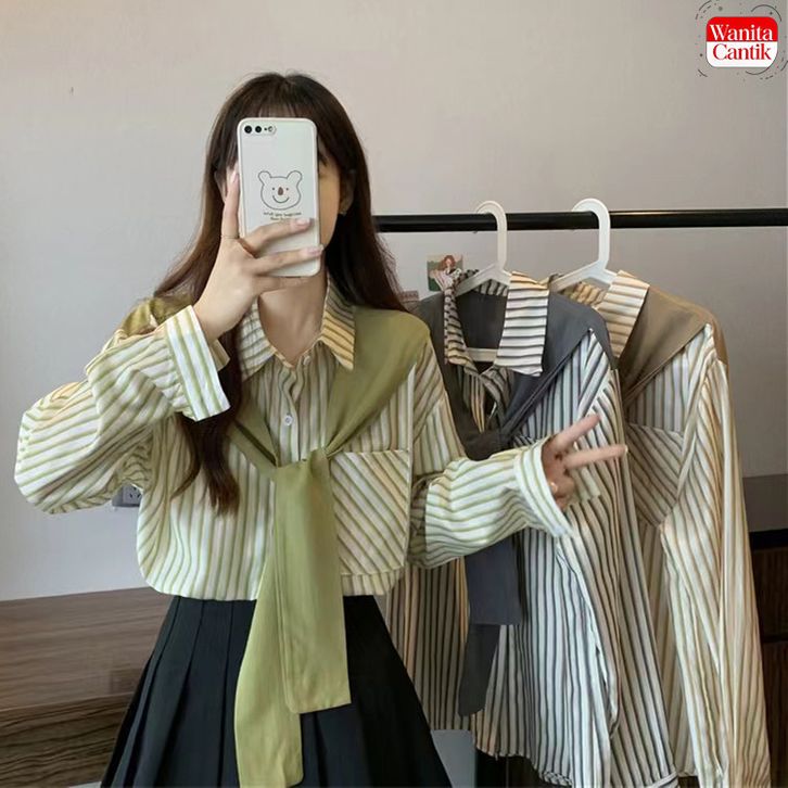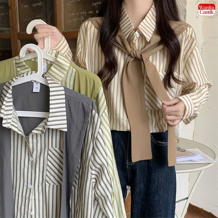 Kemeja Wanita Lengan Panjang M0del Korea Desa1n Fashionable dengan Ker4h Selend4ng dan Motif Garis Longgar dan Stylish