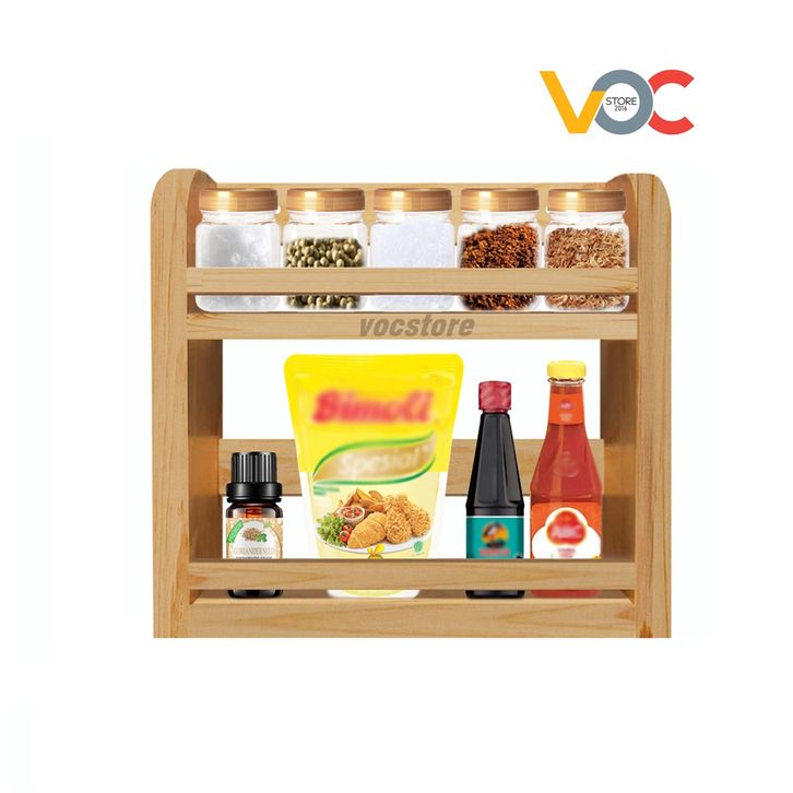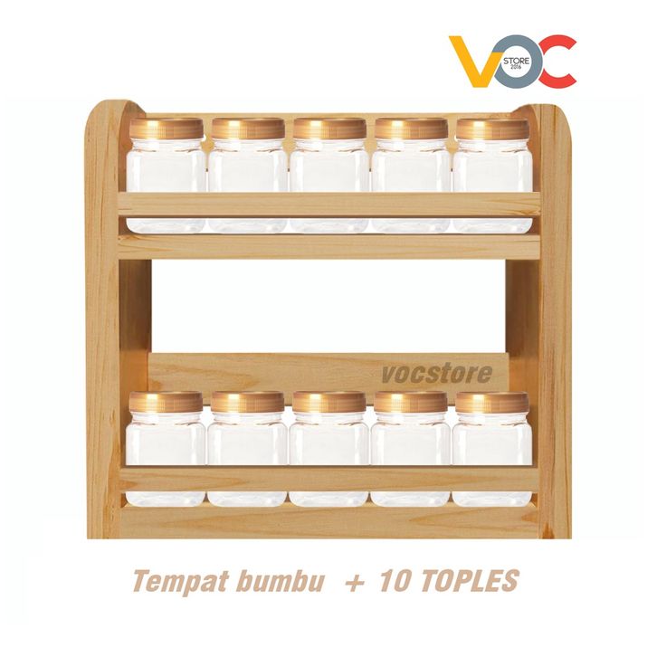 Tempat Bumbu Kayu 2 Tingkat dengan 10 Toples Dapat Sticker Bumbu / Rak Kayu Bumbu / Rak Tempat Bumbu / Toples Bumbu Mura