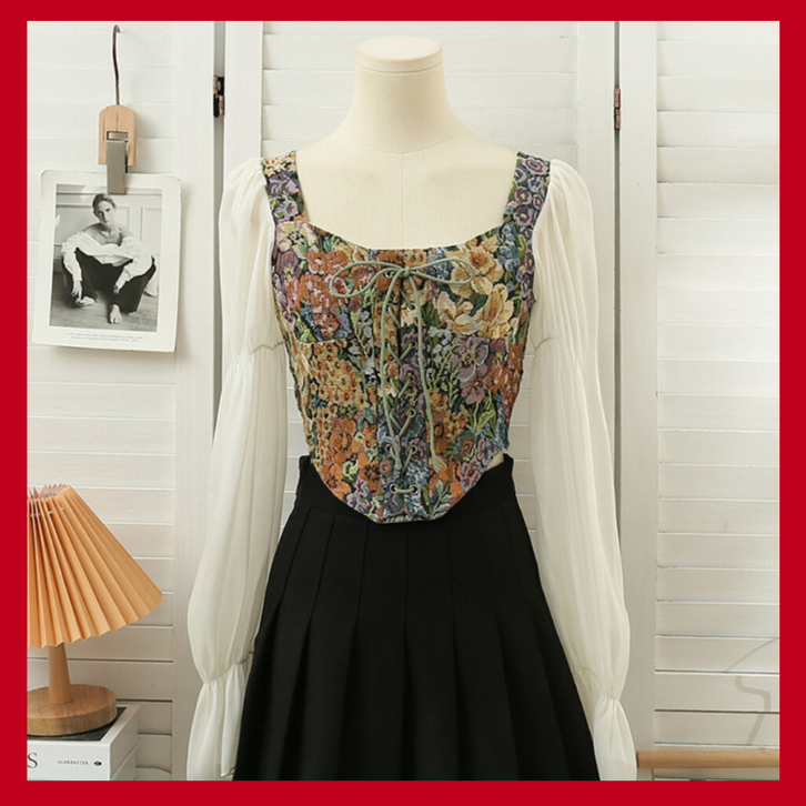 MAMAMARA - ATASAN BAJU CROP KARET KEMEJA WANITA VINTAGE TOP DOLL TENUN BUNGA SLIM-FITTING ALA KOREA