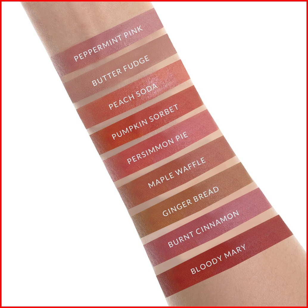 Bloody Mary, Burnt Cinnamon, Butter Fudge, Candy Apple, Ginger Bread, Maple Waffle, Peach Soda, Peppermint Pink, Persimmon Pie, Pumpkin Sorbet