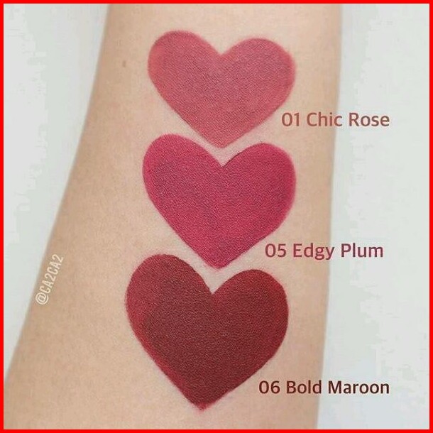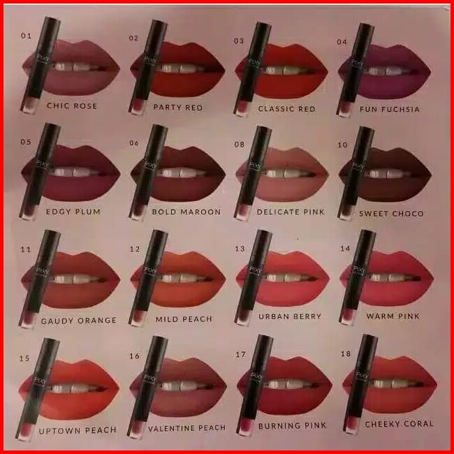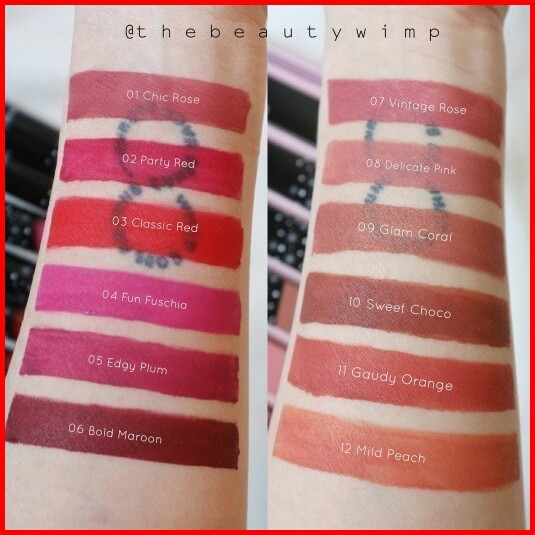 01. Chic Rose, 02. Party Red, 03. Classic Red, 04. Fun Fuschia, 05. Edgy Plum, 06. Bold Maroon, 08. Delicate pink, 10. Sweet choco, 11. Gaudy orange, 12. Mild peach, 13. Urban berry, 14. Warm pink, 15. Uptown peach, 17. Burning pink, 18. Cheeky Coral, 106 Red Fusion, 104 Pop Pink , 408 Merry Orange
