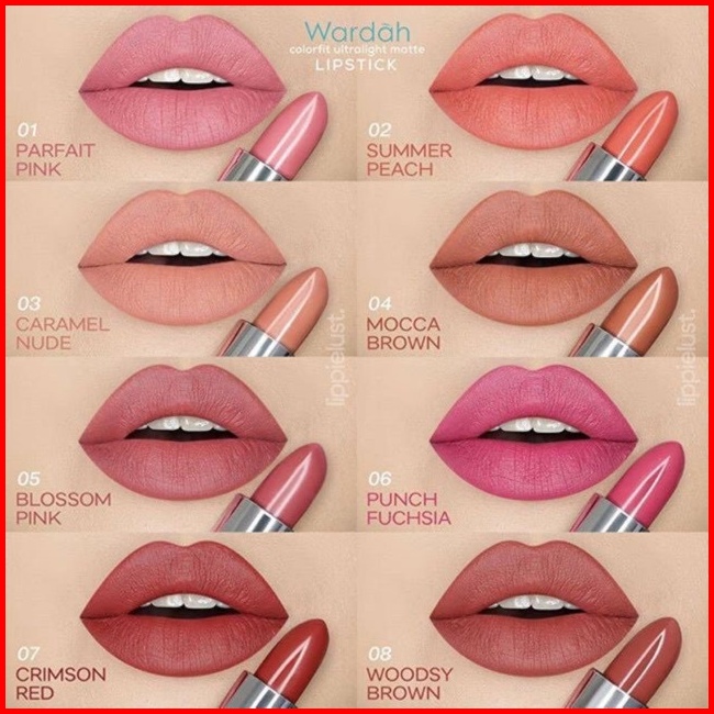 01 Parfait Pink, 02 Summer Peach, 03 Caramel Nude, 04 Mocca Brown, 05 Blossom Pink, 06 Punch Fushia, 07 Crimson Red, 08 Woodsy Brown