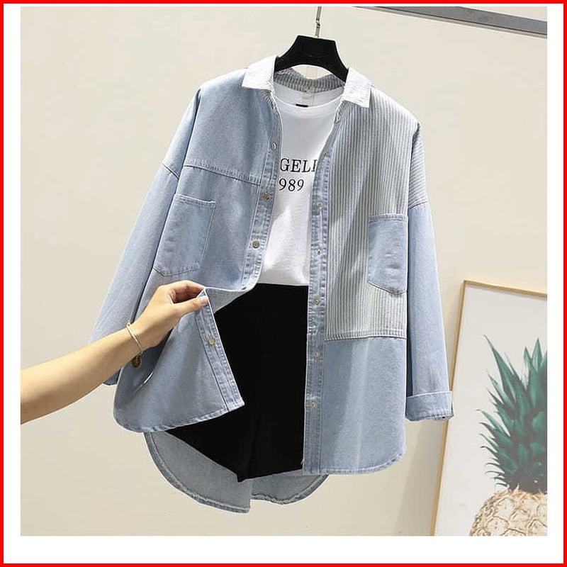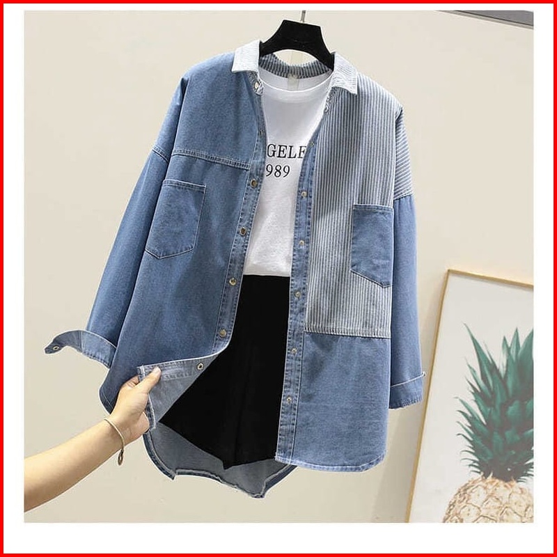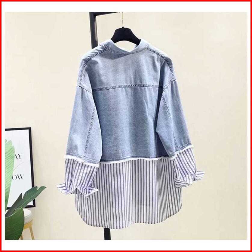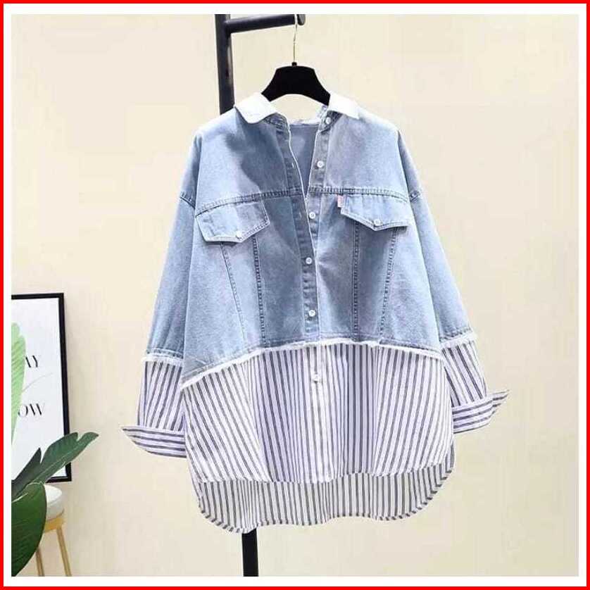 Atasan Jeans Kombinasi Salur Lengan Panjang Kemeja Denim Kombinasi Salur Style Korea