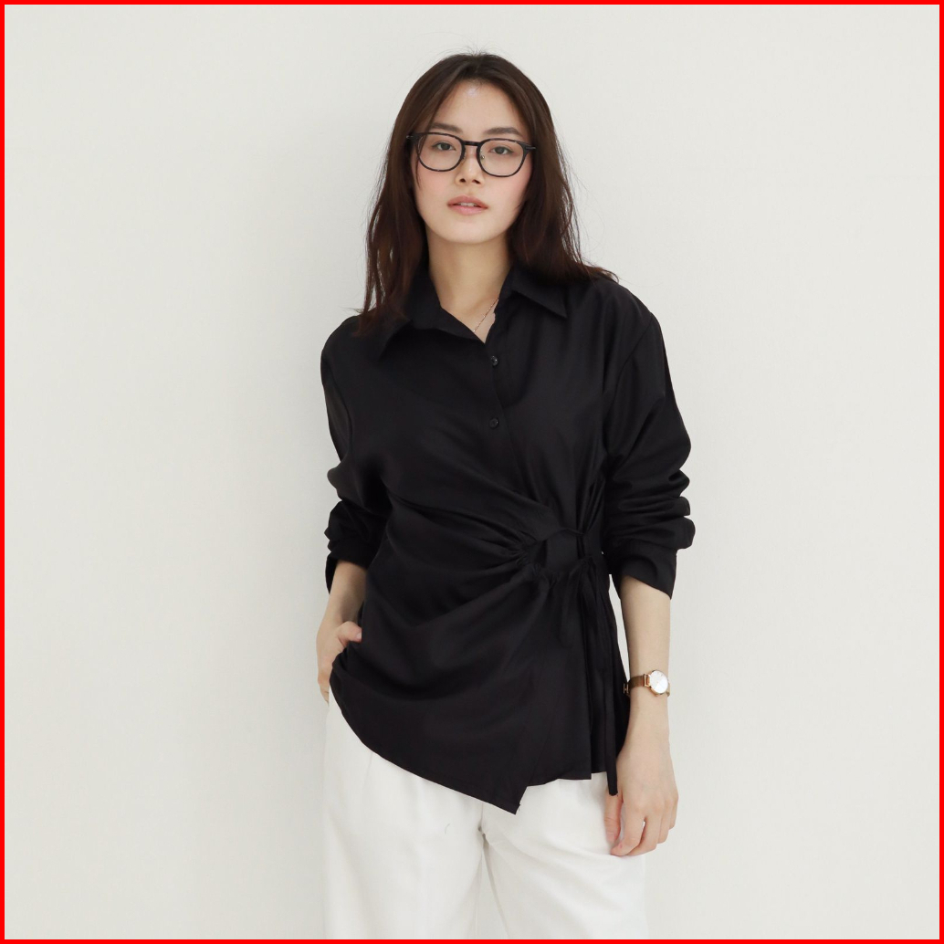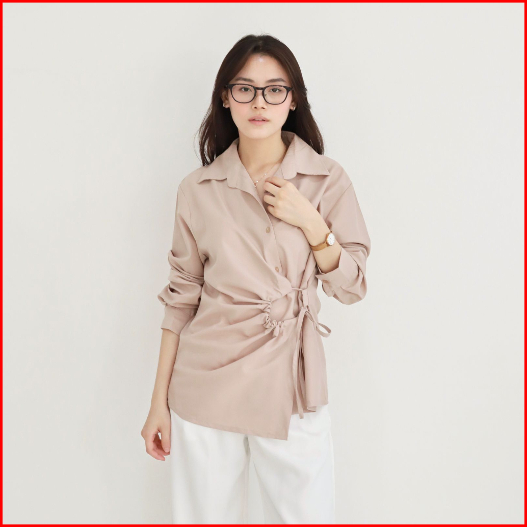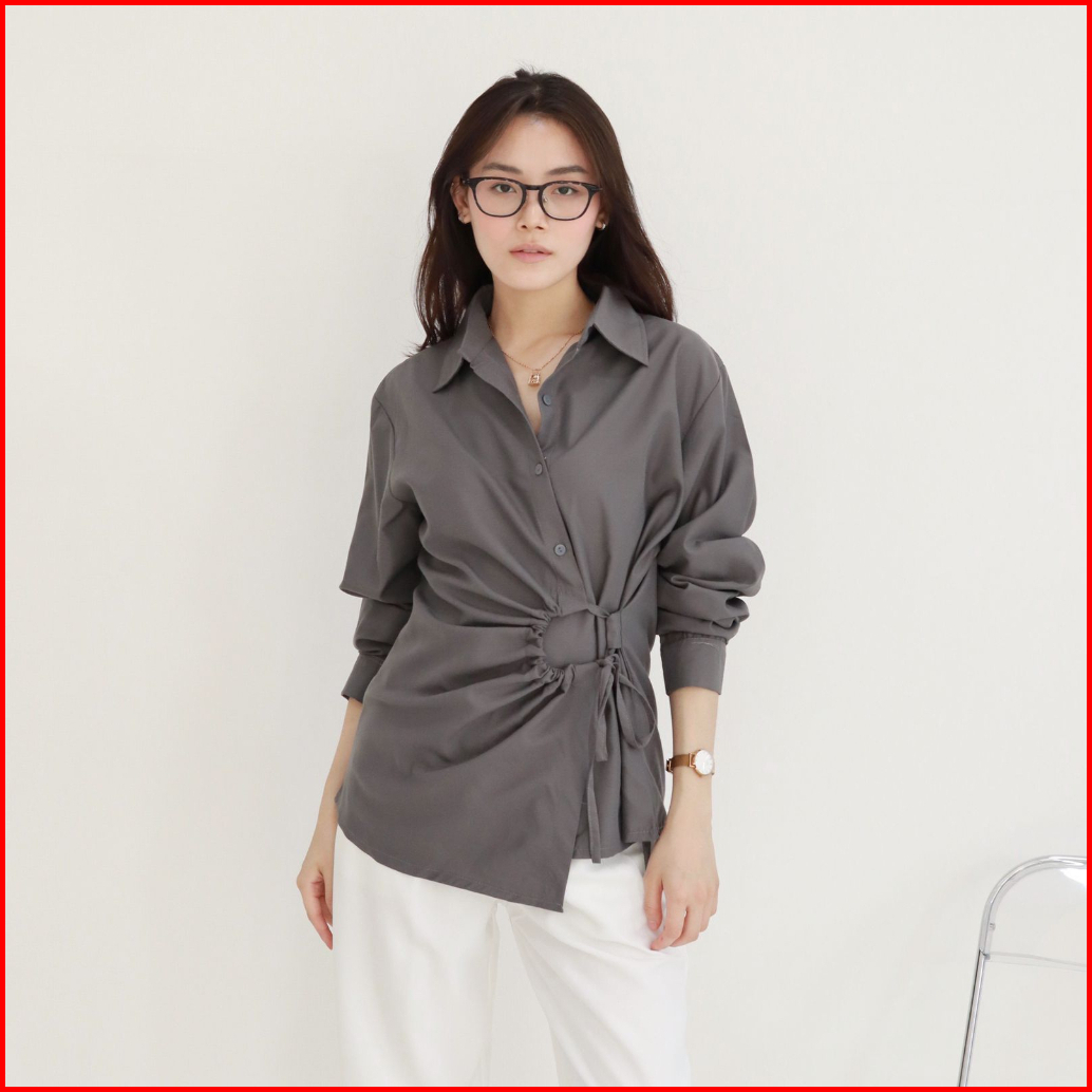 Msmo Karis Assymetrical Shirt Blouse Wanita Basic Kemeja Wanita Casual Brown Grey