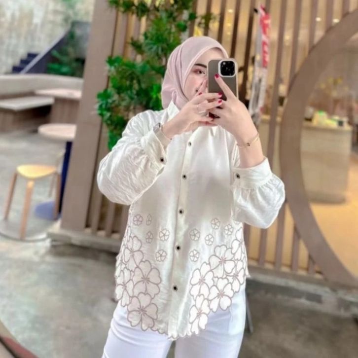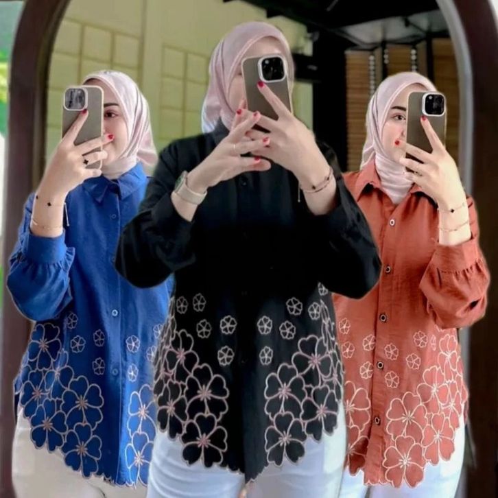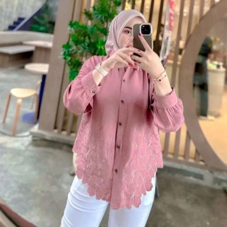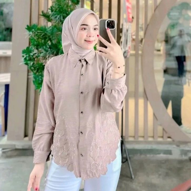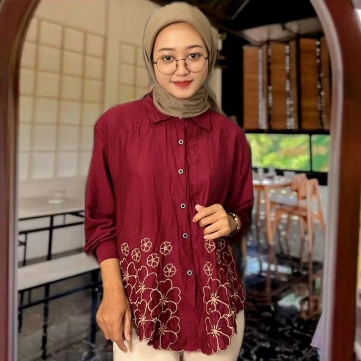 Kemeja Wanita Deanda Motif Bordir Kemeja Polo Linen Motif Bunga Bordir Kekinian Blouse Korean Style Terbaru