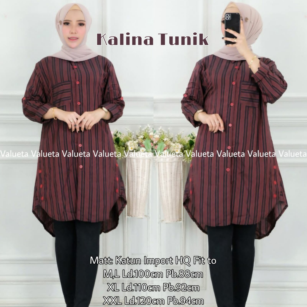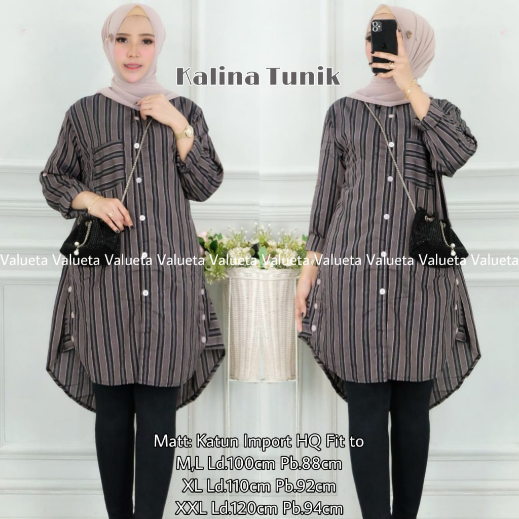 ATASAN TUNIK WANITA KALINA KLIPBUSANA - MIDI DRESS HIJAB PEREMPUAN MOTIF SALUR LURIK - GIRL LONG SHIRT
