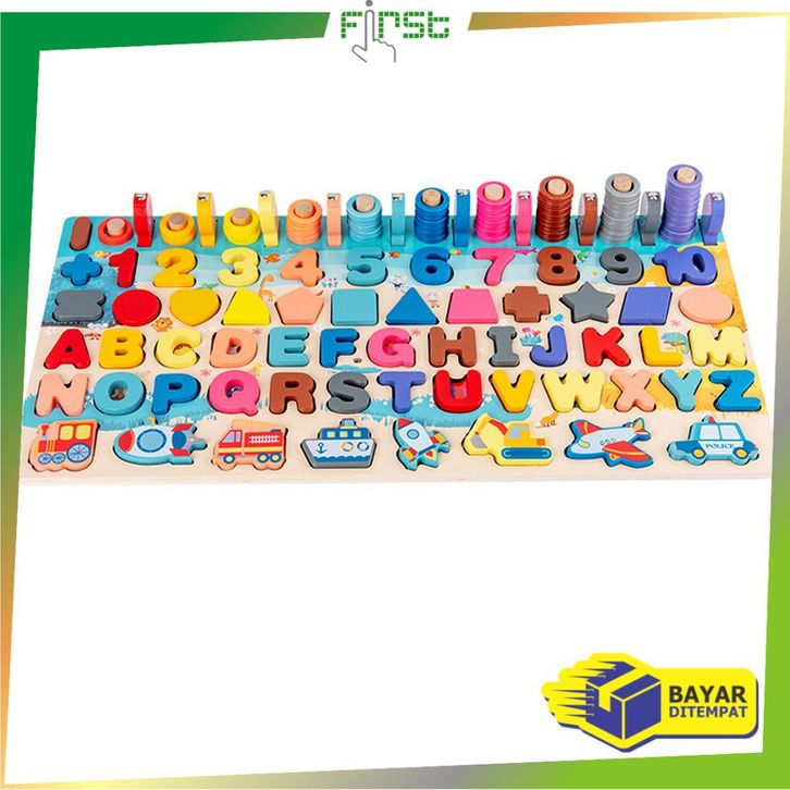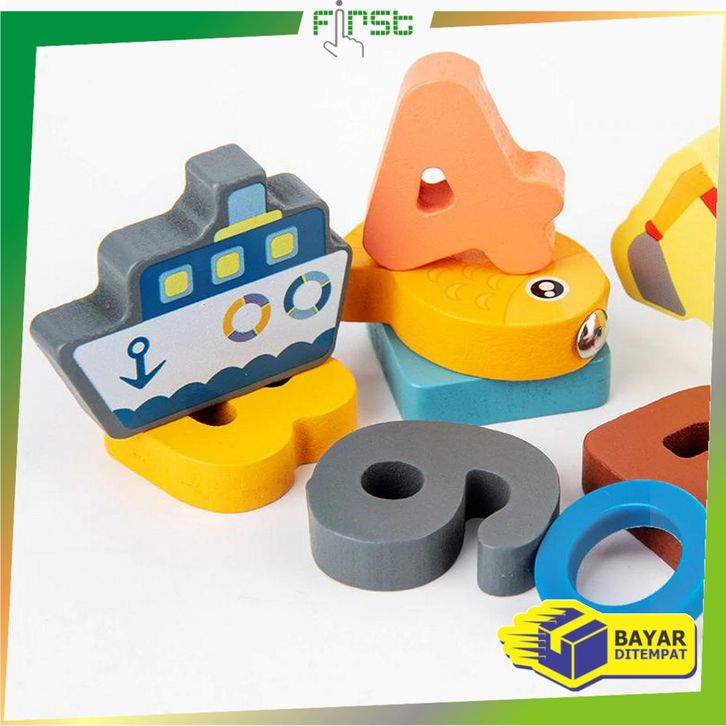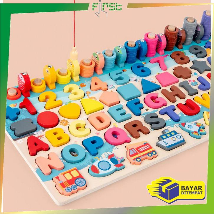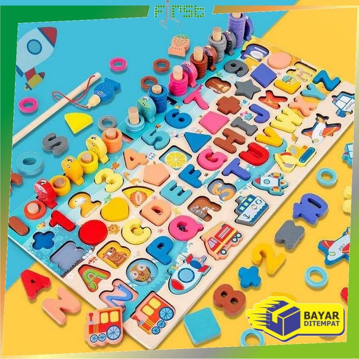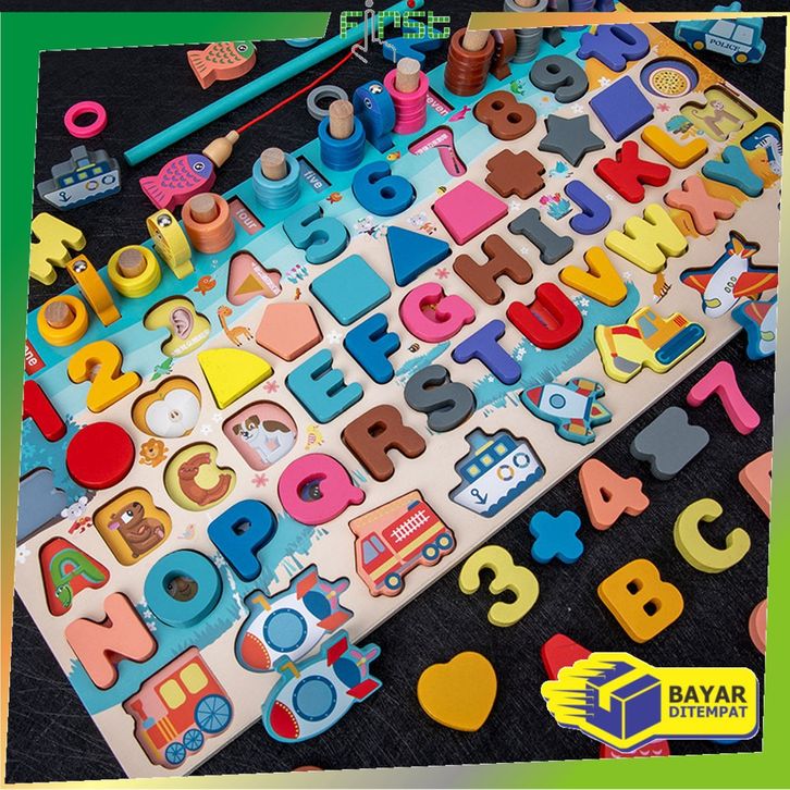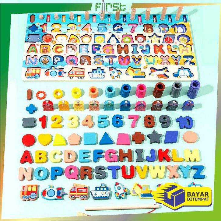 Mainan Edukasi FH-M94 7in1 Puzzle Kayu Anak Huruf dan Angka Pancing Ikan Montessori Wooden Toys