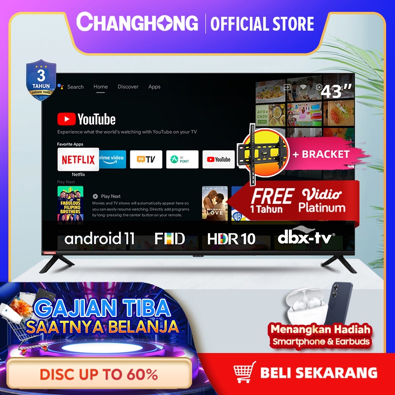 Changhong 43 Inch Newest Android 11 Frameless Smart TV Google certified Digital TV FHD LED TV-L43G7N FREE BRACKET