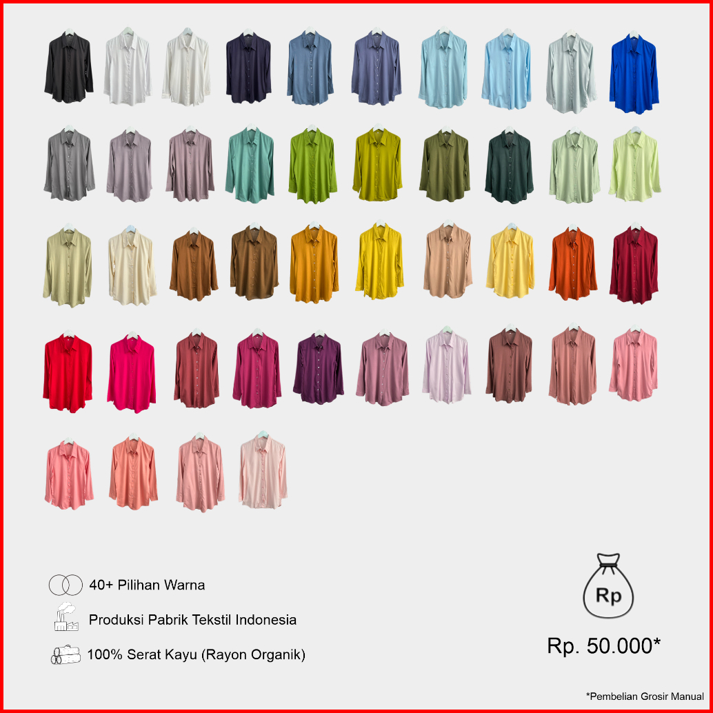 Kemeja Abu, Kemeja Almond, Kemeja Aqua, Kemeja Army, Kemeja Caramel, Kemeja Coklat Khaki, Kemeja Coral, Kemeja Forest, Kemeja Hijau Mint, Kemeja Hitam, Kemeja Lilac, Kemeja Magenta, Kemeja Maroon, Kemeja Mustard, Kemeja Navy, Kemeja Nude Pink, Kemeja Pink, Kemeja Purple, Kemeja Putih, Kemeja Putih BW, Kemeja Red Brick, Kemeja Rose Gold, Kemeja Sky Blue, Kemeja Smoke, Kemeja Steel Blue