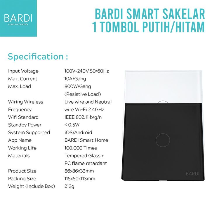 BARDI Smart Wall Switch Touch EU1 Gang WiFi Saklar Pintar
