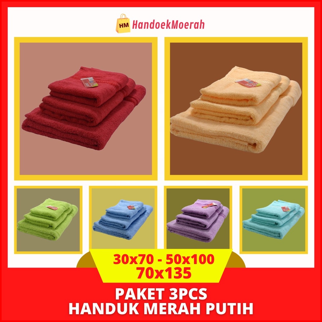 Paket Isi 3 Pcs Handuk Mandi Dewasa Murah Towel Merah Putih All Size Dewasa-anak-muka 70x135 50x100 30x70