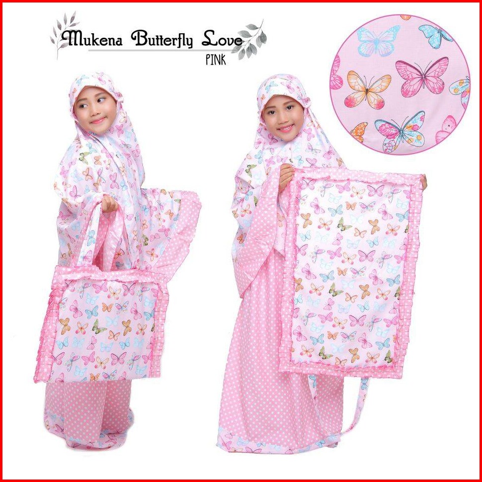 Pusat Mukena Indonesia - Mukena Anak Katun Butterfly Love Pink Tas Sajadah