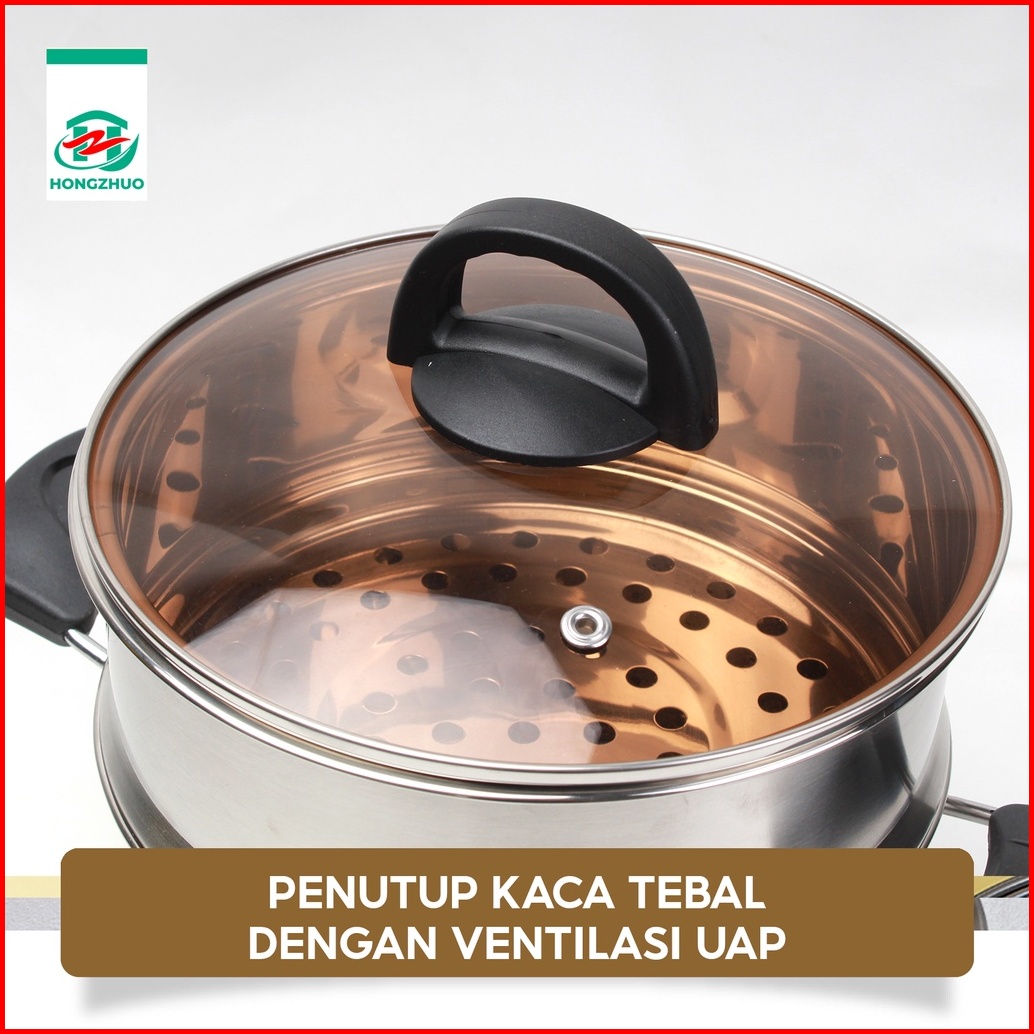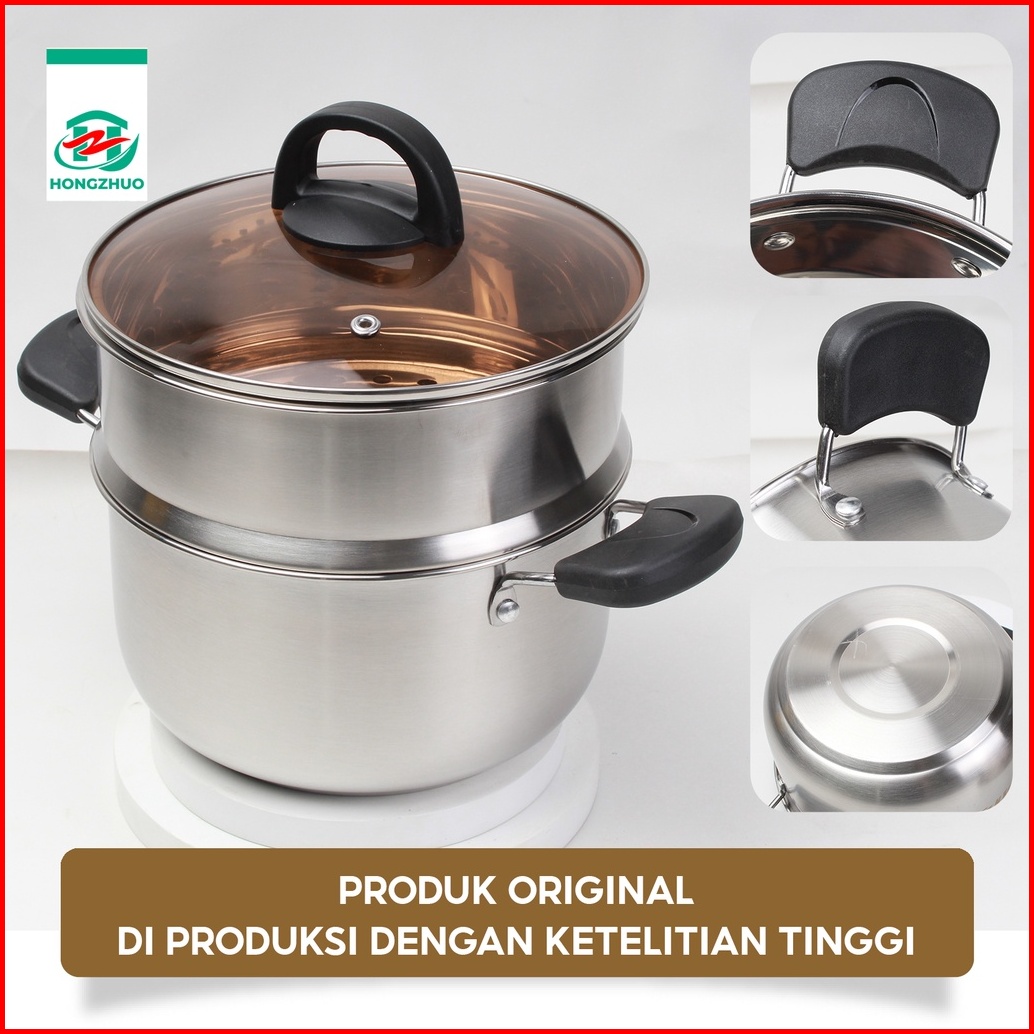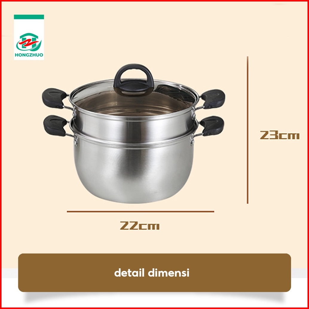 Hongzhuo Panci Kukus Steam Pot 2 Tingkat Full Stainless Steel 22cm Tutup Kaca