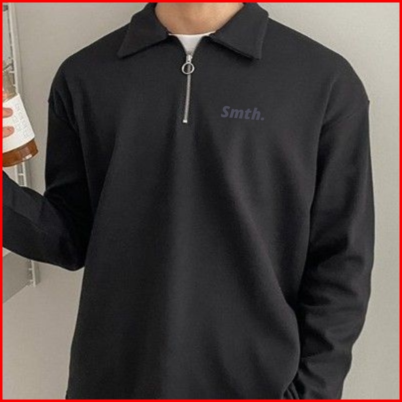 Crewneck Zipper Smith Teks Hitam Sweater Berkerah Sweatshirt Cotton Fleece Tebal