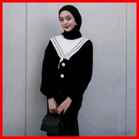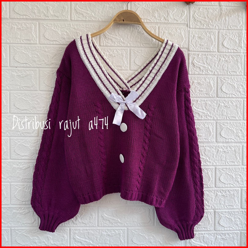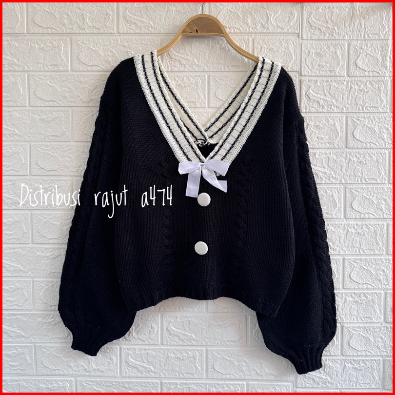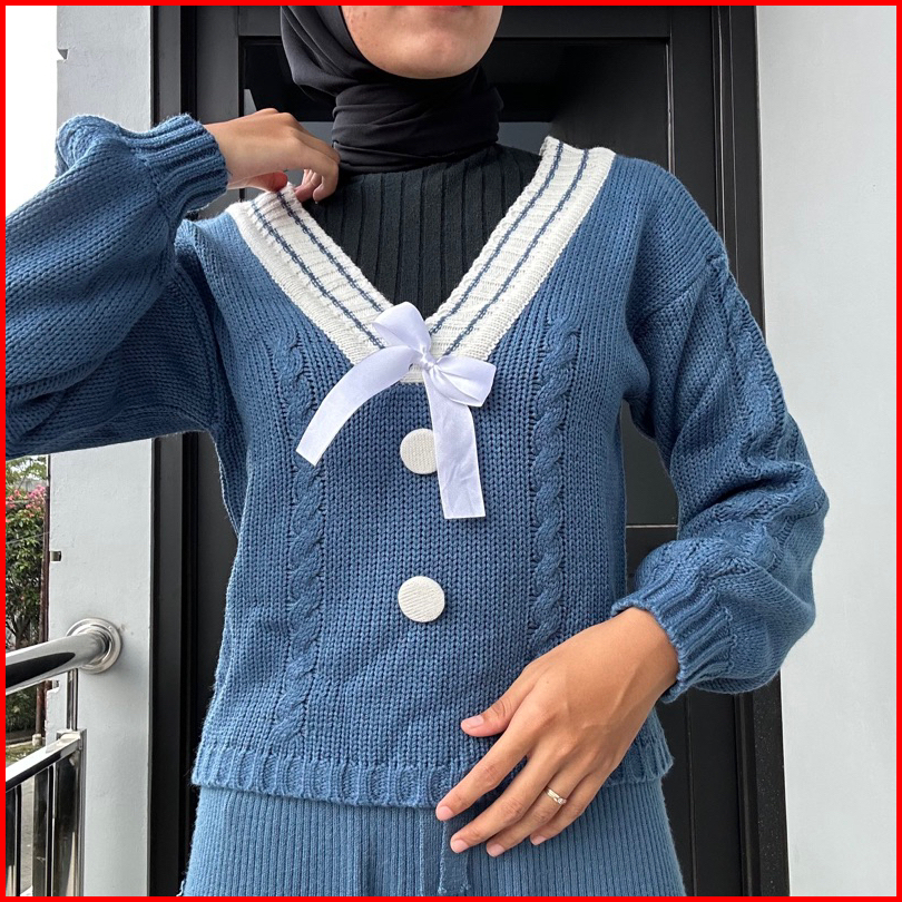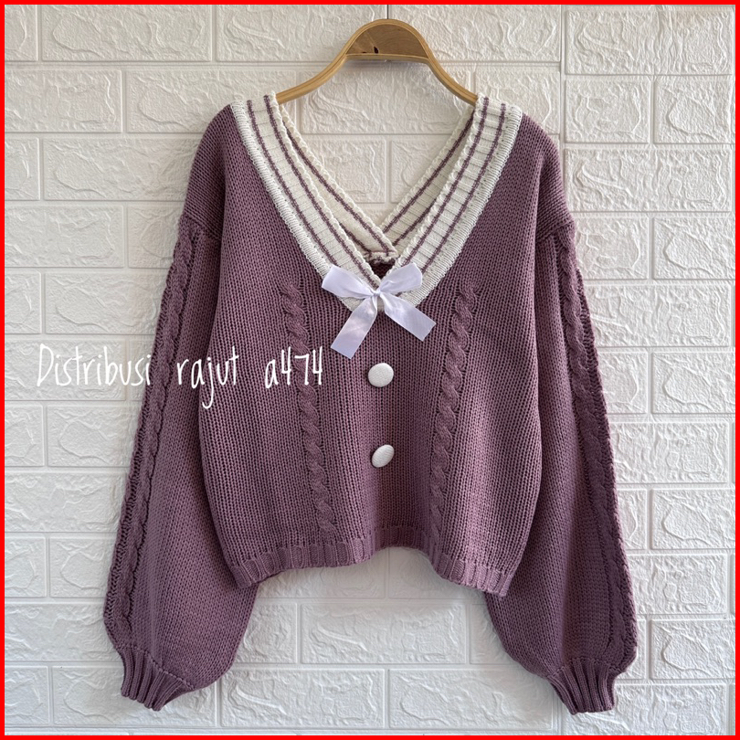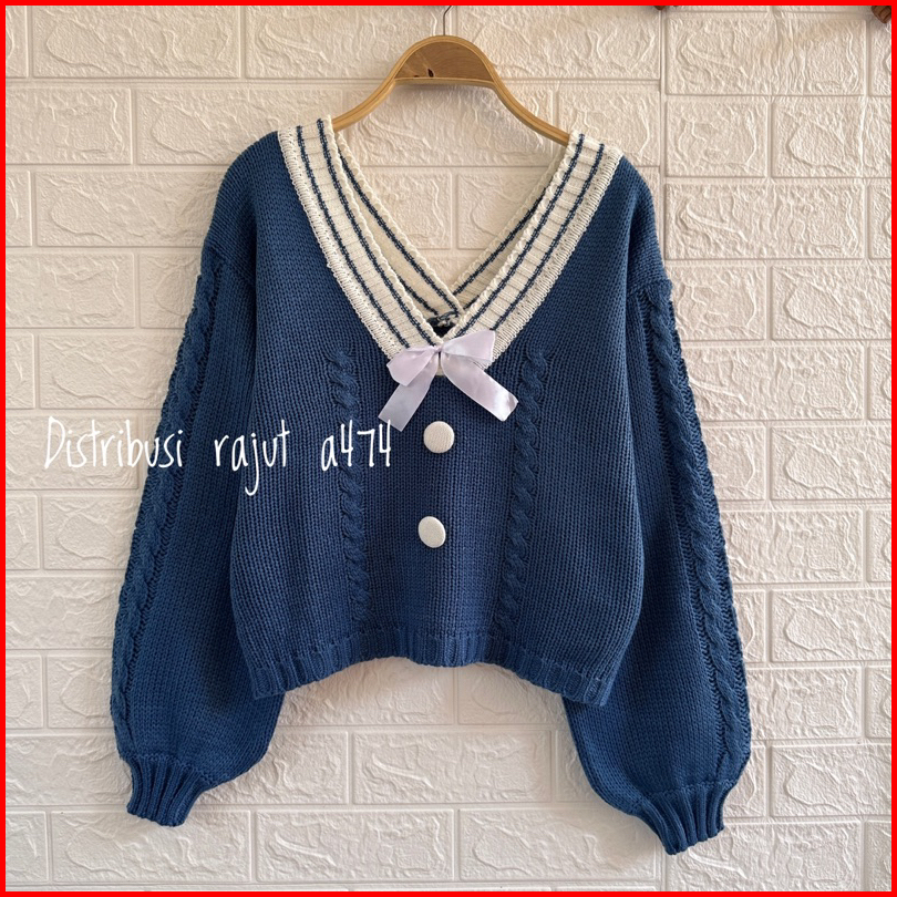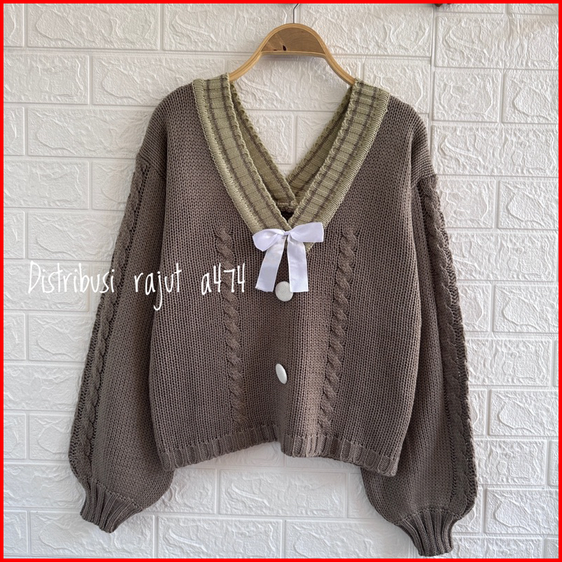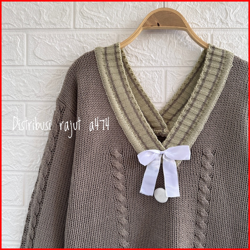 Ussy Sweater Rajut Tebal Baju Rajut Motif Cable Kerah V Pita Kancing Wanita 5 Gate Korean Stayle