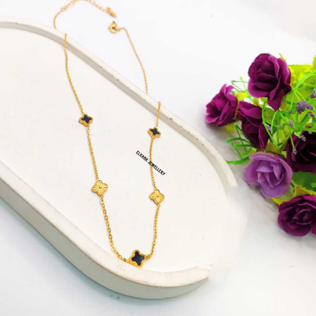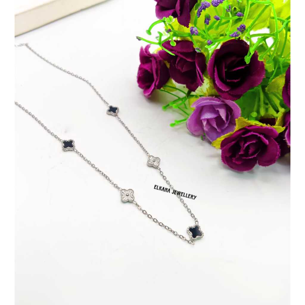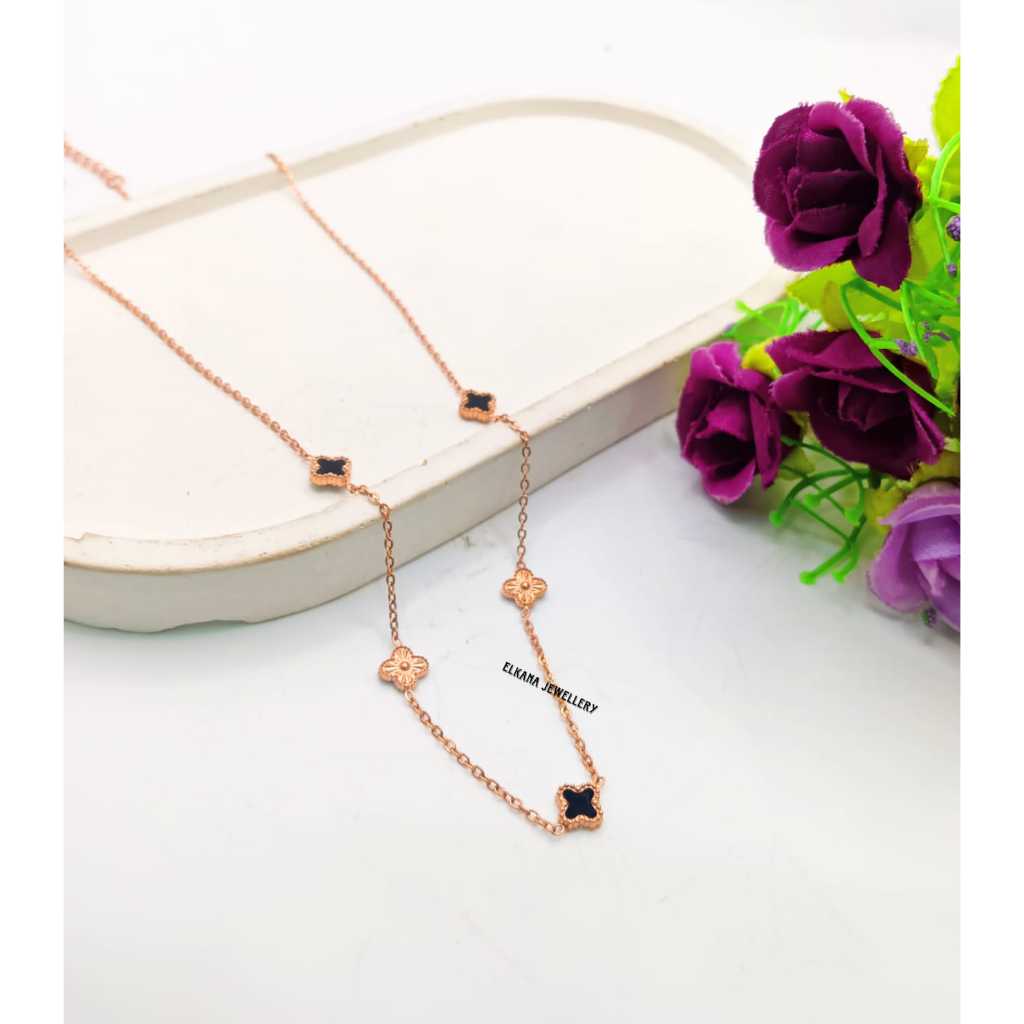 KALUNG TITANIUM FASHION BUNGA CLVR BOLAK BALIK 6 MM HITAM PERHIASAN SUPER BERKELAS KOREA ANTI KARAT DAN ANTI LUNTUR