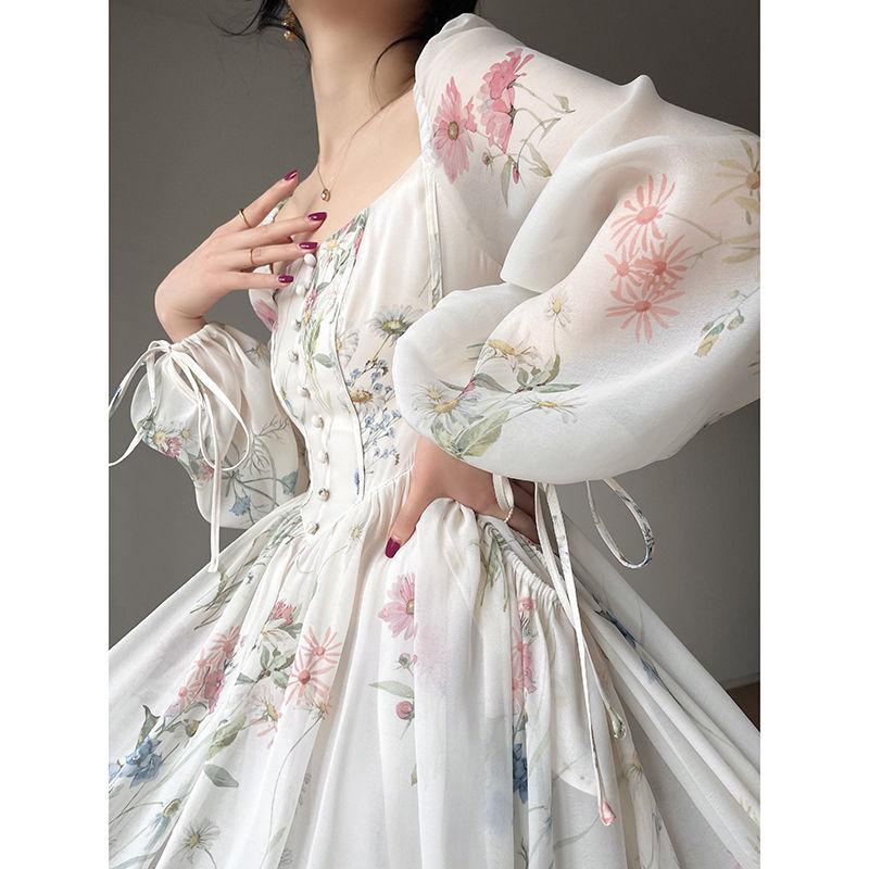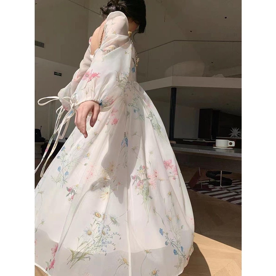 GAUN WANITA KASUAL LENGAN PANJANG MIDI DRESS CHIFON RETRO ELEGAN VINTAGE DRESS KONDANGAN FLORAL DRESS