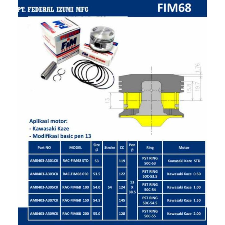 Piston Kit FIM Kawasaki Kaze Pen Pin 13 DM 53 | 53.5 | 54 | 54.5 | 55 mm