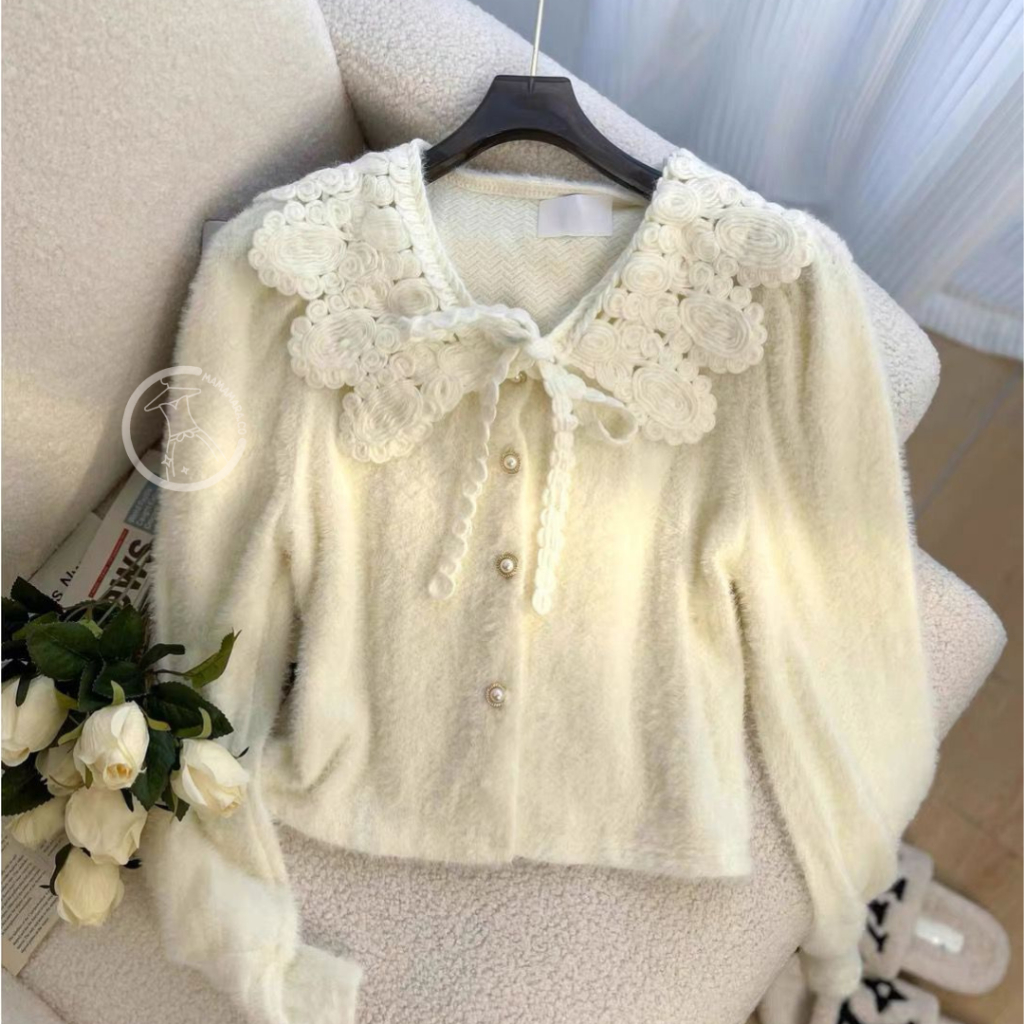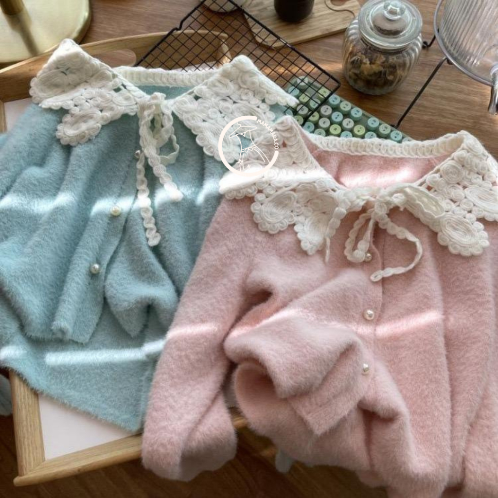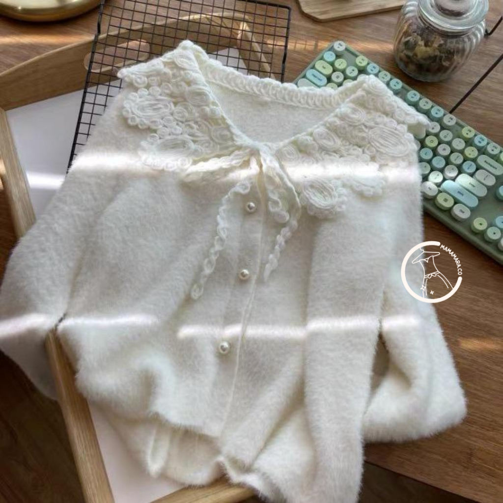 MAMAMARA - CARDIGAN RAJUT KERAH LACE BULU HALUS ATASAN WANITA LENGAN PANJANG LEMBUT FUZZY