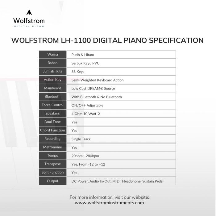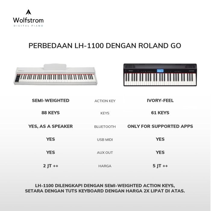 Wolfstrom TH-1700 Semi Weighted Keys Digital Piano Keyboard Elektrik - LH-1100 Hitam, Non Bluetooth