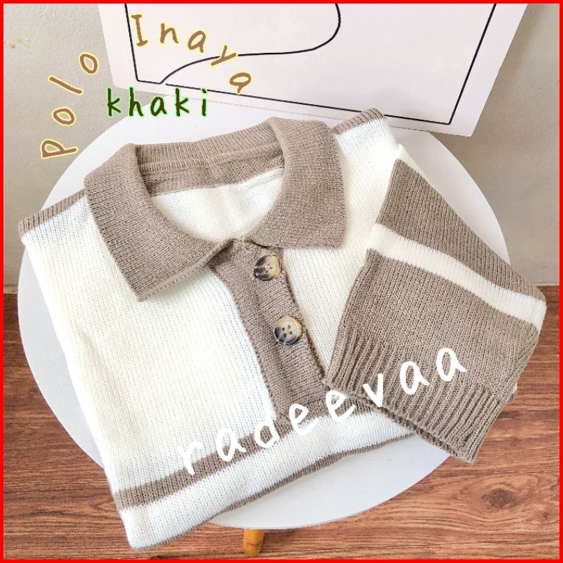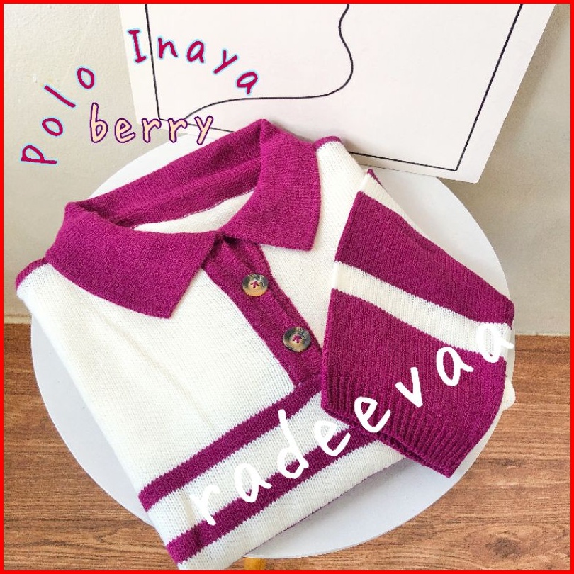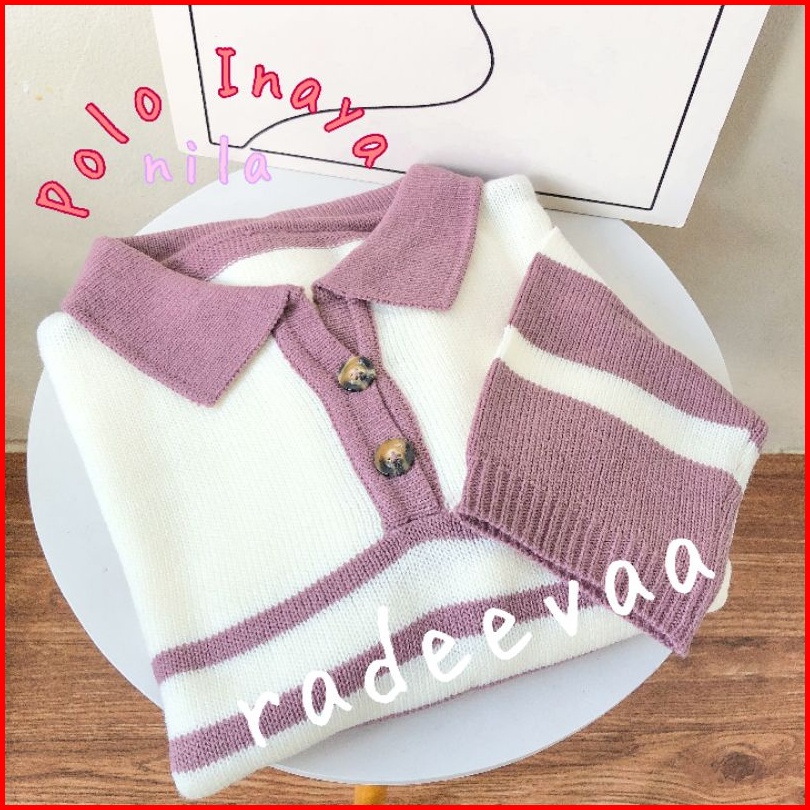 Polo Sweater Crop Inaya Stripe Knit Oversize Top Atasan Rajut Wanita Motif Garis Berkerah Korea