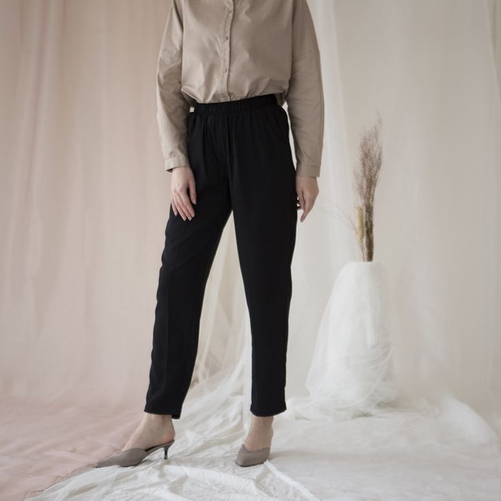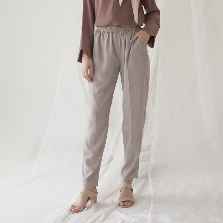 Celana panjang wanita lurus pinggang karet warna Hitam, Light Grey, Olive, Sand